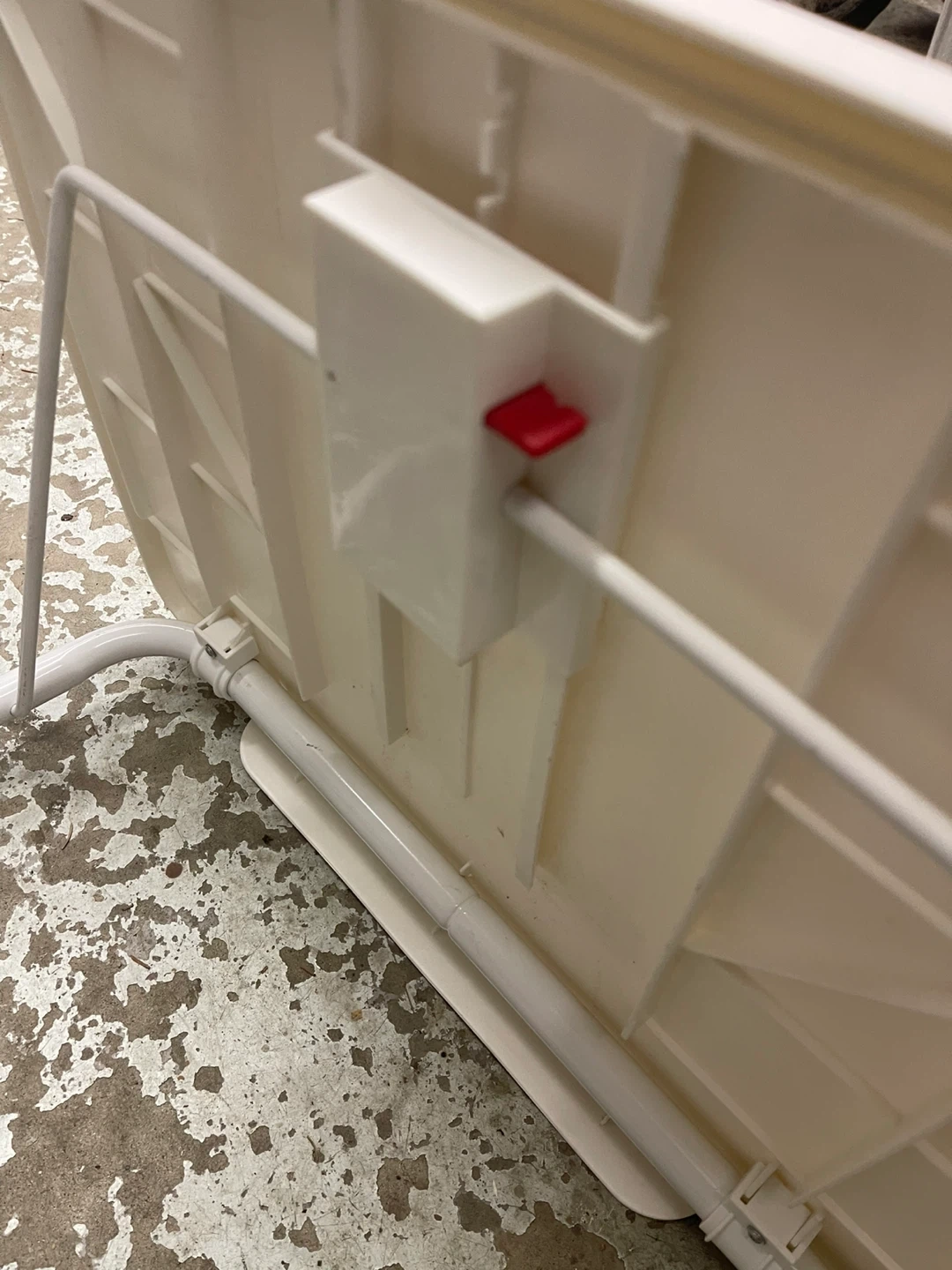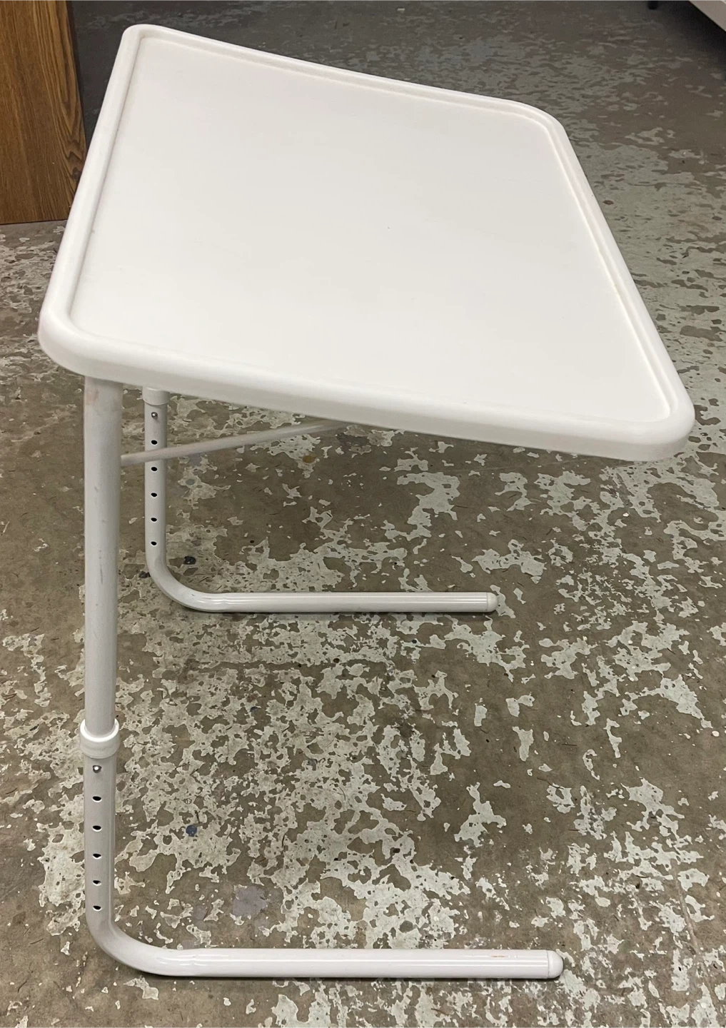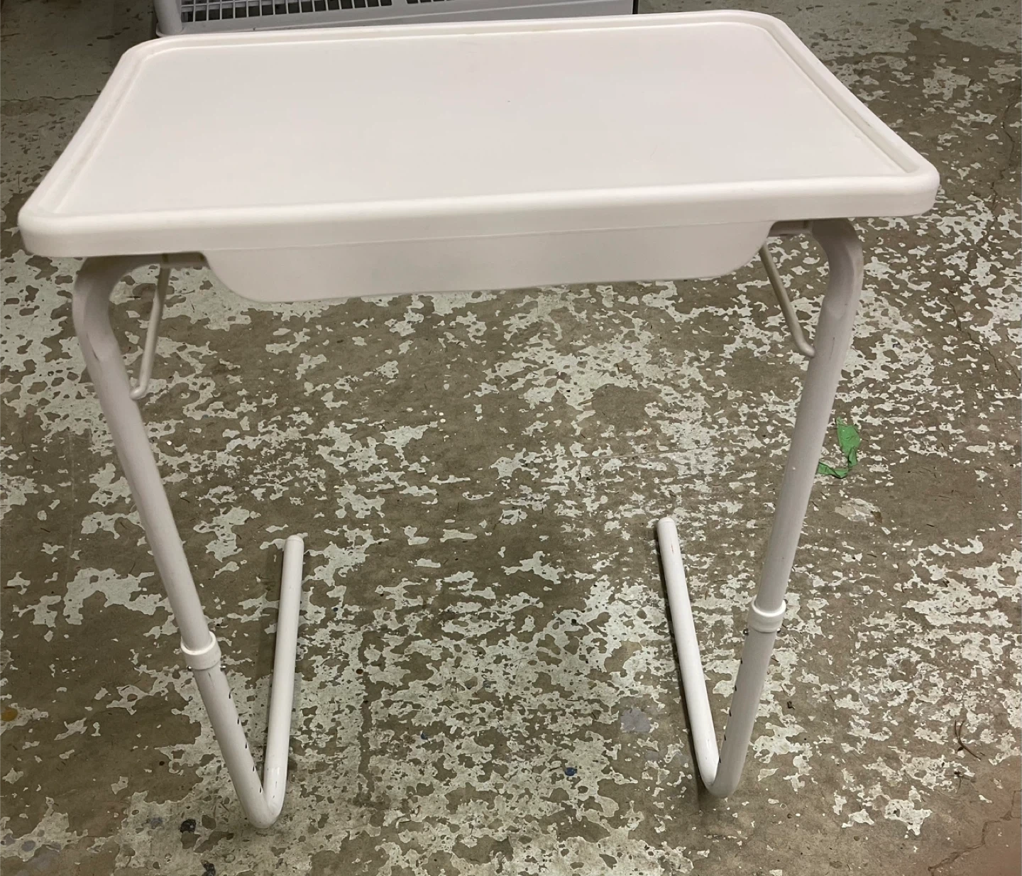 A handy white TV tray table with adjustable height settings. It's made of sturdy plastic and metal. Folds away easily for storage. Hight 21.5” to 27.5” x 20.5”W x 15.5”D. Cash only.