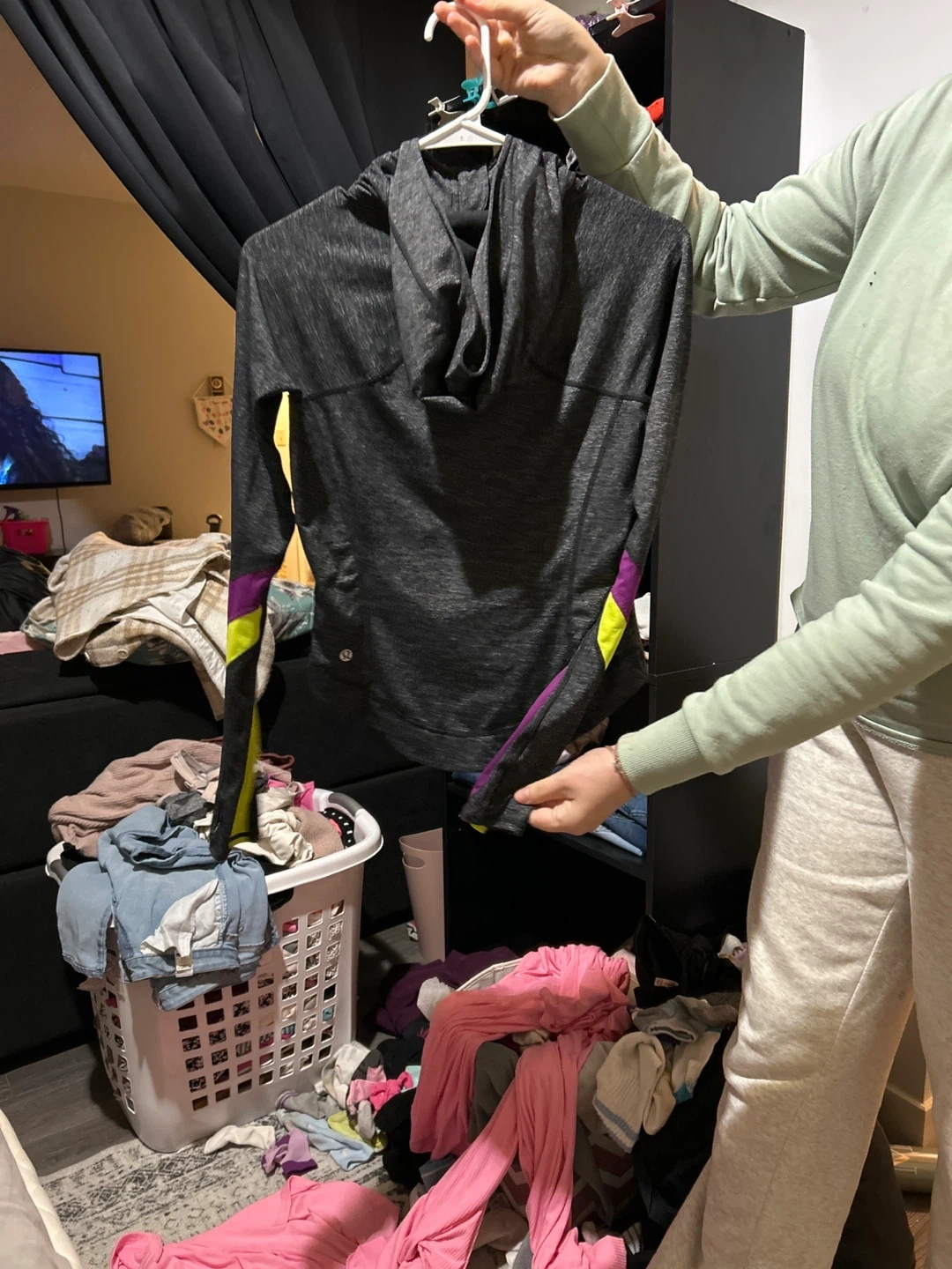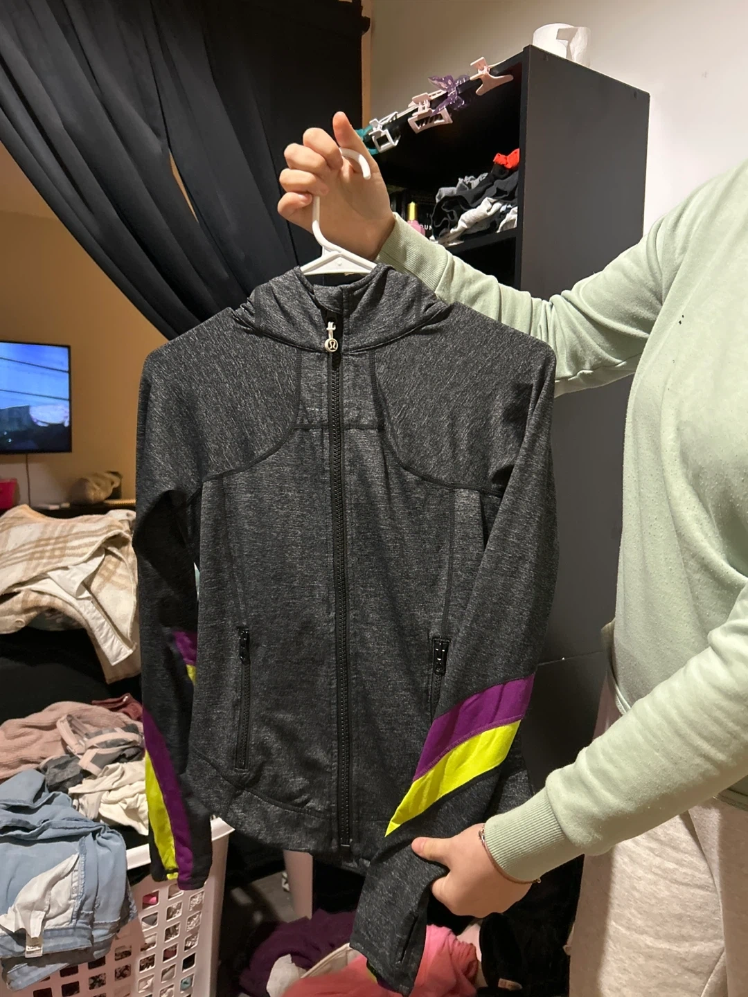 Lululemon grey hooded running jacket with purple and yellow accents. It has a full zipper and zippered pockets. Made from breathable fabric. Tagless but authentic lululemon sweater size medium