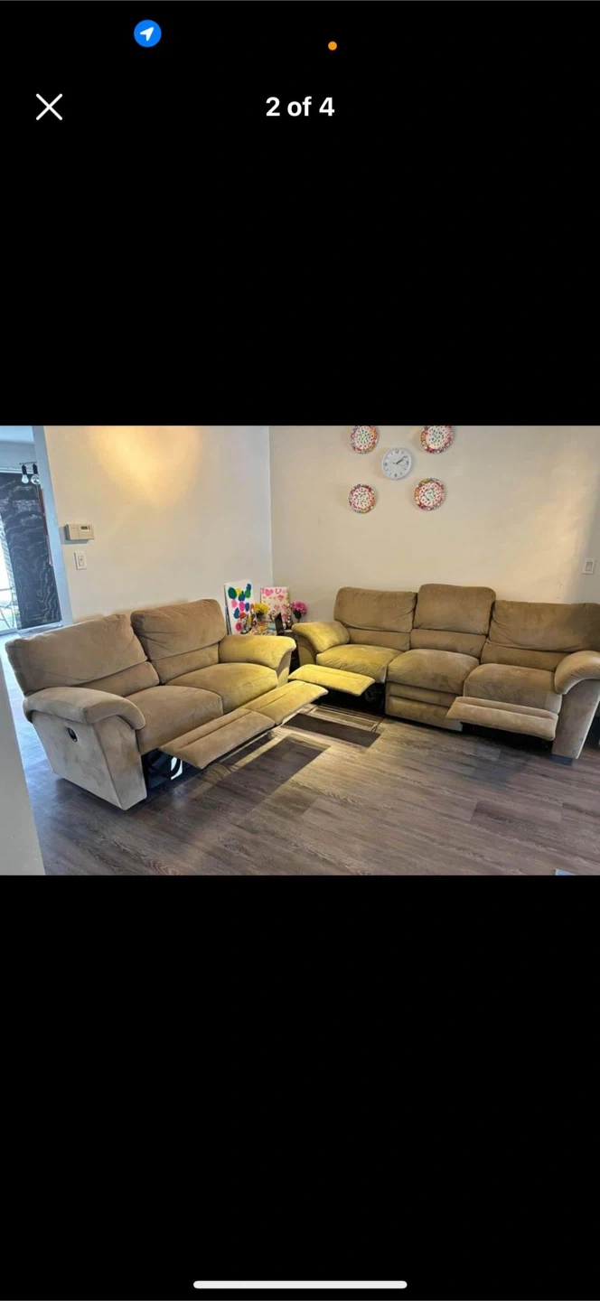 Three-piece reclining sofa set in a neutral beige colour. It's made of a soft, durable fabric. This set includes a sofa and two recliners. Perfect for a family room or living space!