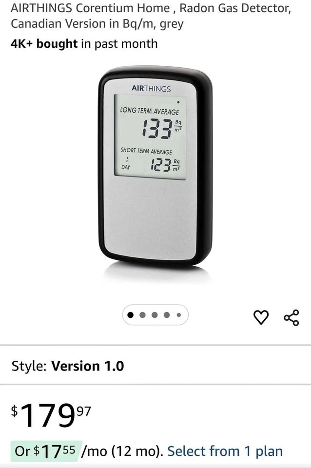 Accurate AIRTHINGS Corentium Home Radon Gas Detector. This is the Canadian Version, measures in Bq/m, and is grey. Version 1.0. No lab fees, quick results in 24 hours. Tracks levels over long periods for more accuracy.