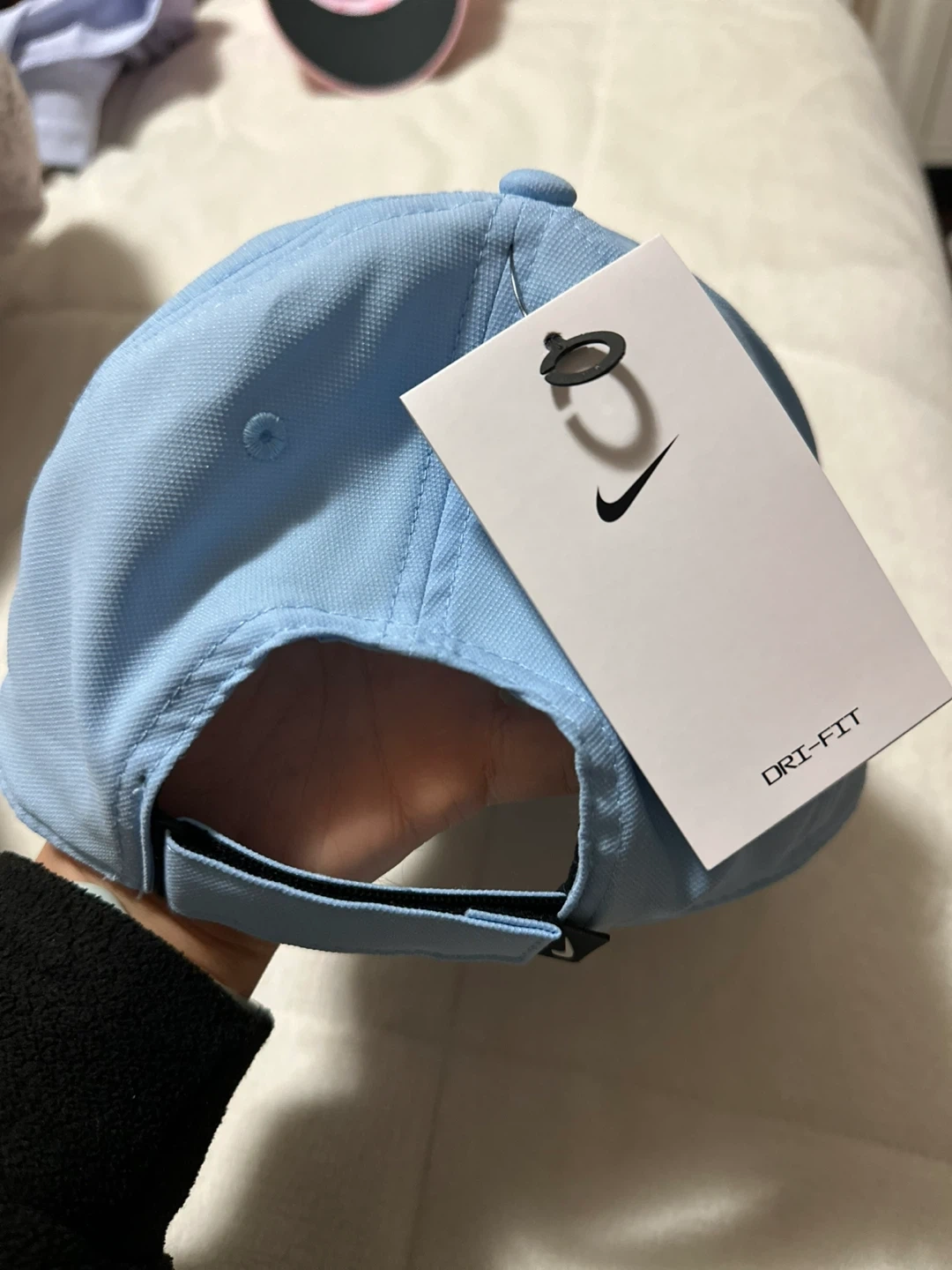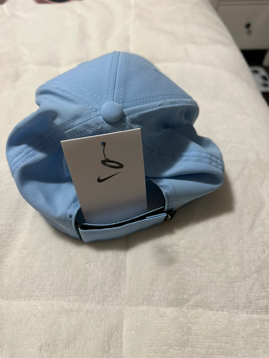 A light blue Nike Legacy91 cap with a white swoosh. It's one size fits all and features Dri-FIT technology. This cap is Adult unisex.