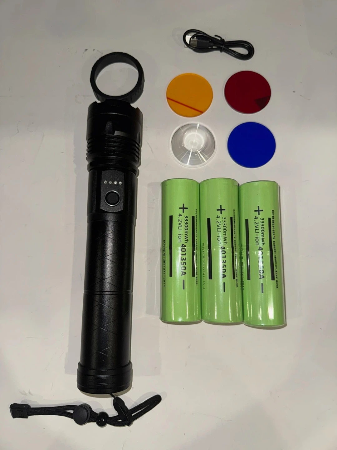 Selling a rechargeable LED flashlight. It comes with multiple colour filters, a charging cable, and three batteries. Great for camping or emergencies!