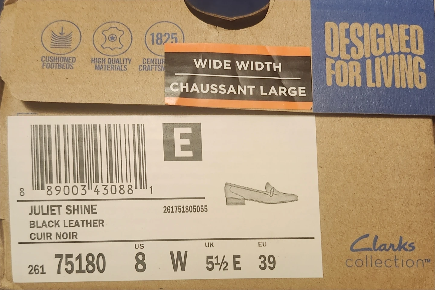 Selling a pair of Clarks Juliet Shine loafers in black leather! These are a size 8 wide width. They come in the original box and are in great condition. The box highlights the cushioned footbeds and high-quality materials. A stylish and comfortable choice!