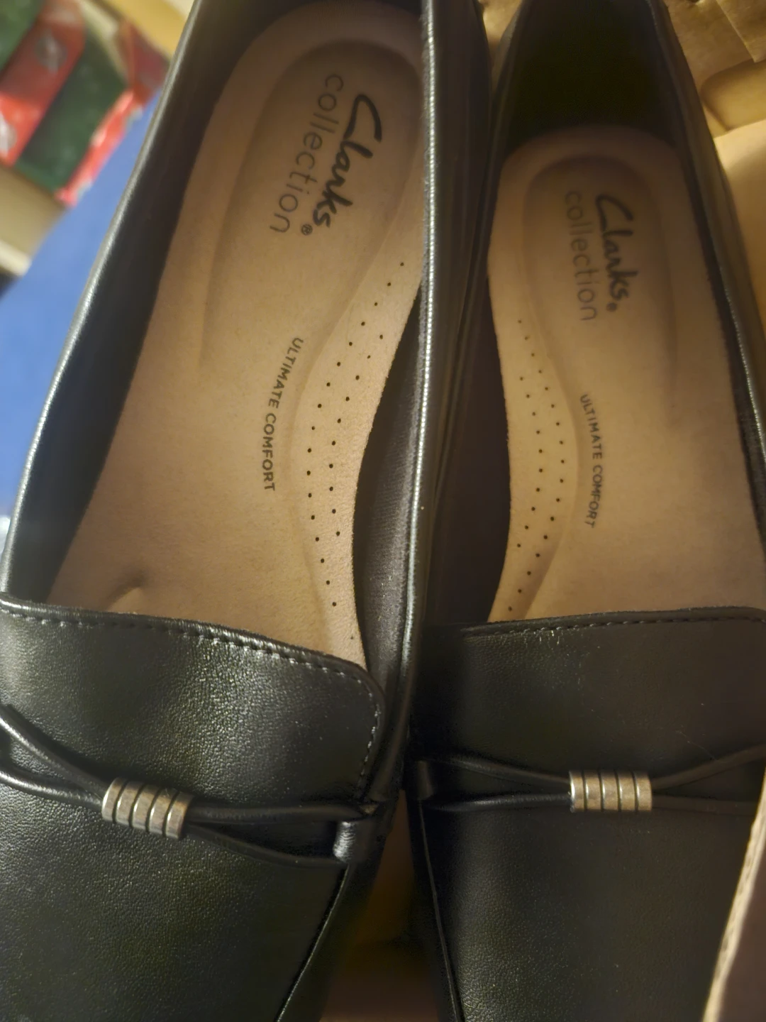 Selling a pair of Clarks Juliet Shine loafers in black leather! These are a size 8 wide width. They come in the original box and are in great condition. The box highlights the cushioned footbeds and high-quality materials. A stylish and comfortable choice!