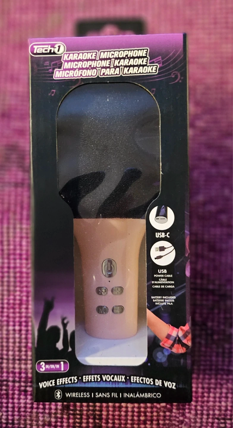 Wireless karaoke microphone with 3 voice effects: Monster, Diva, and Mic-King. It's built-in rechargeable battery and USB charging (cable not included). This microphone is great for parties or performances!
