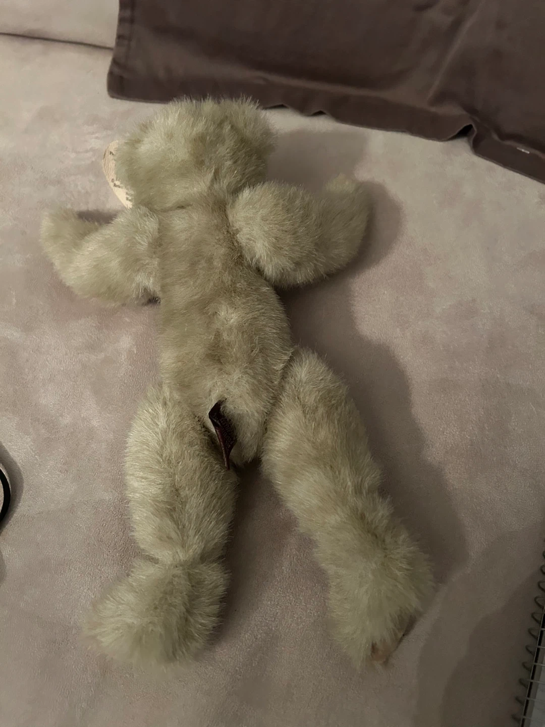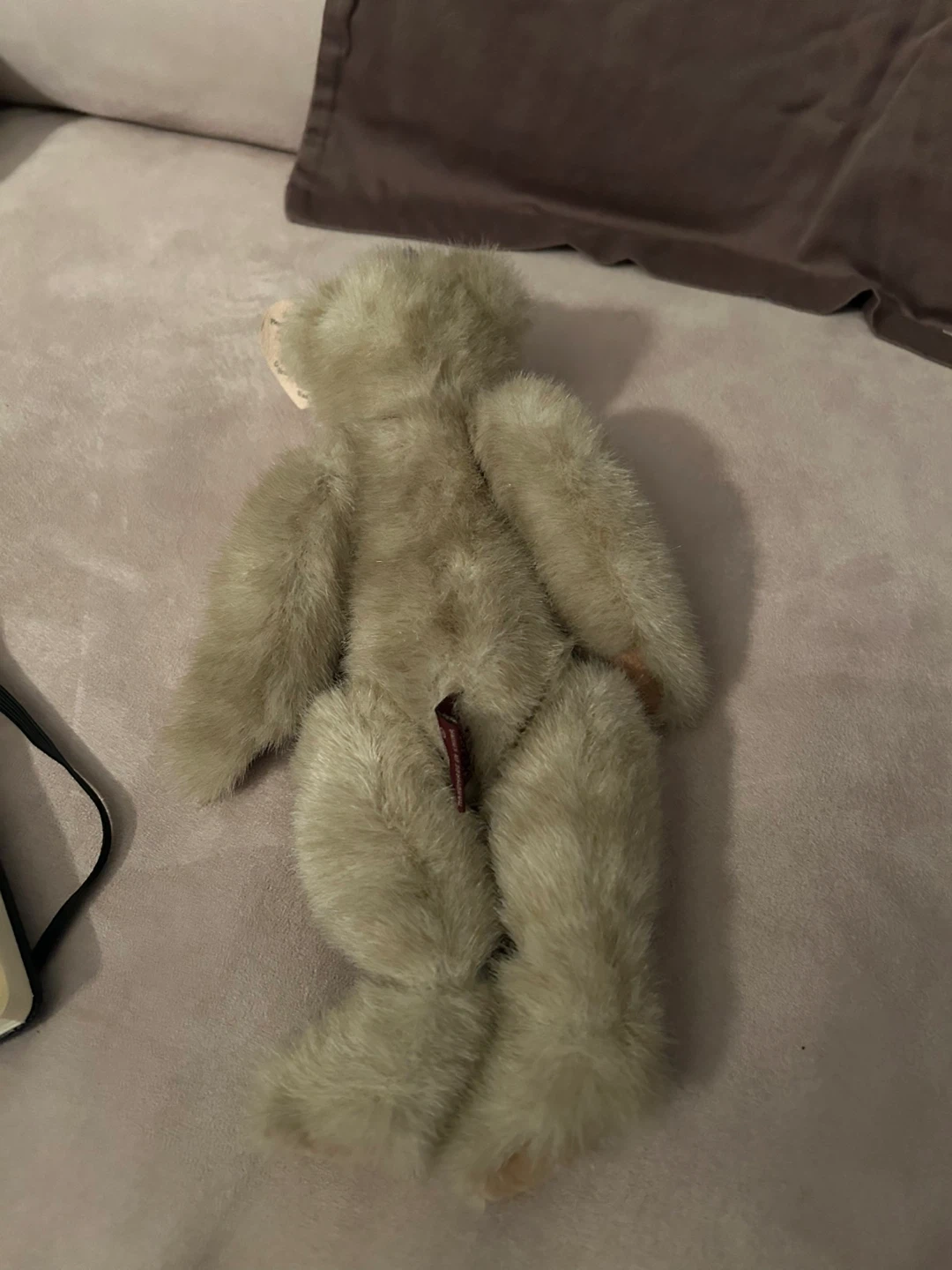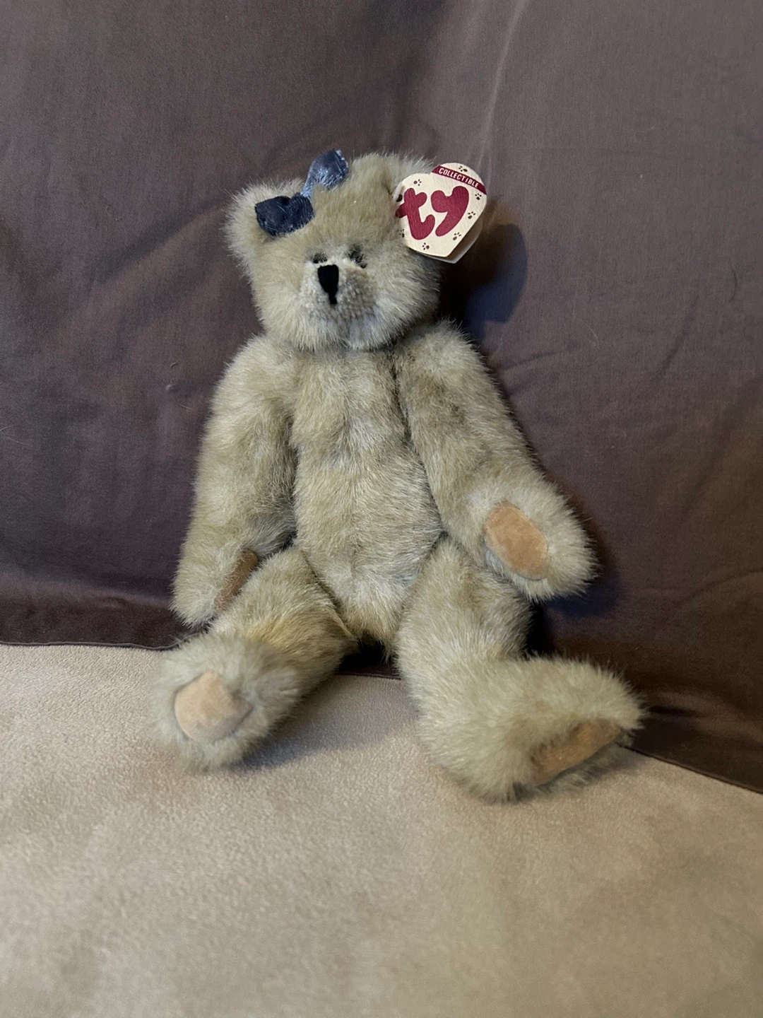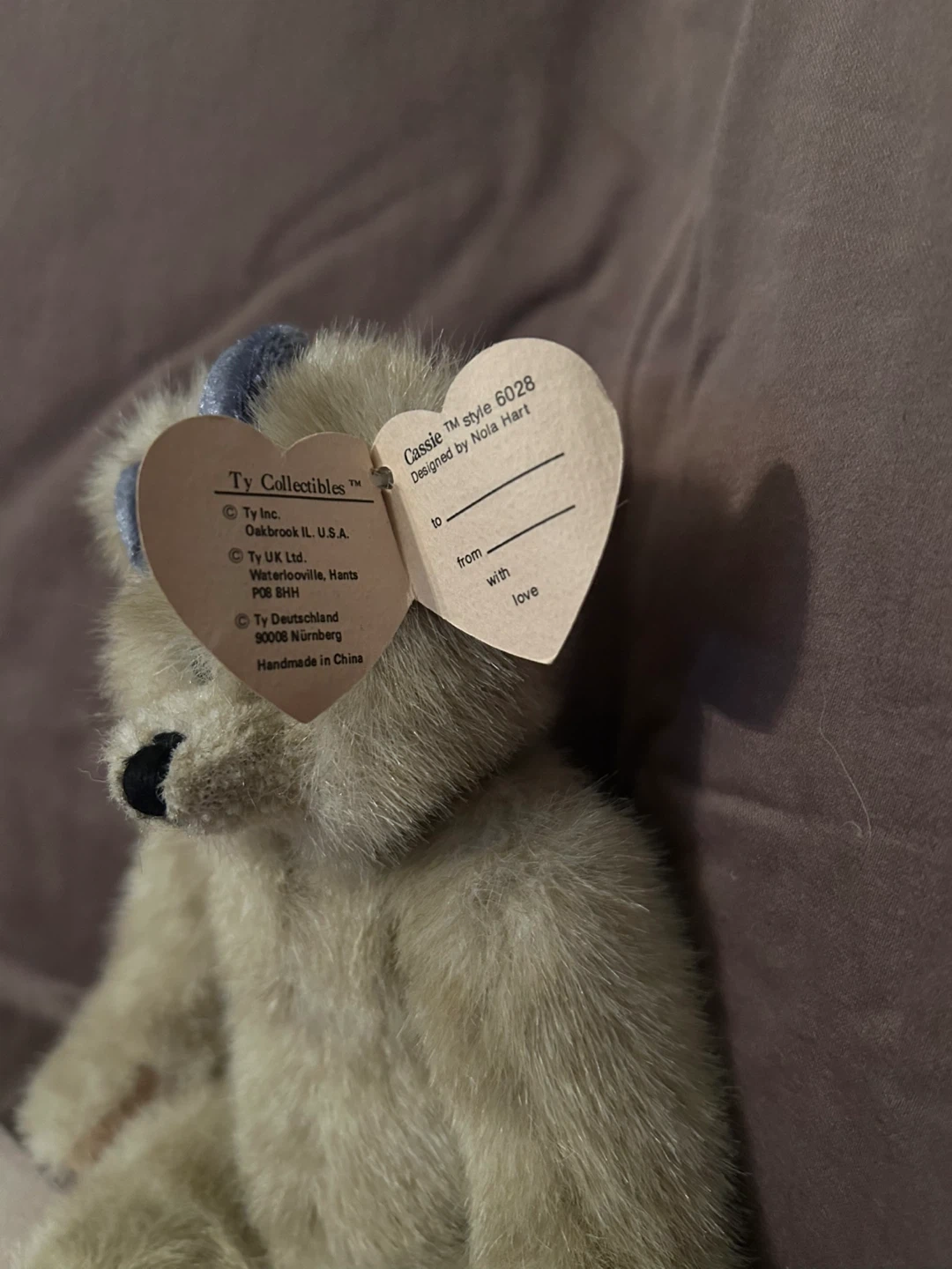 This is a Ty Collectibles Cassie bear, style number 6028, designed by Nola Hart. It's a plush teddy bear with a blue bow. This collectible is approximately 11”.tags attached.Moveable arms and legs