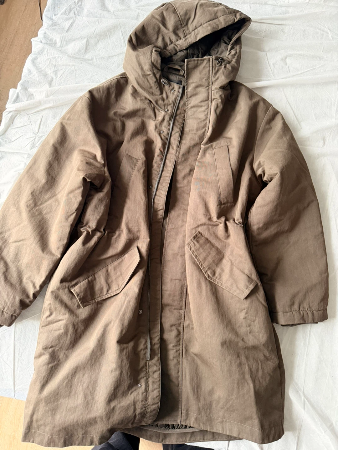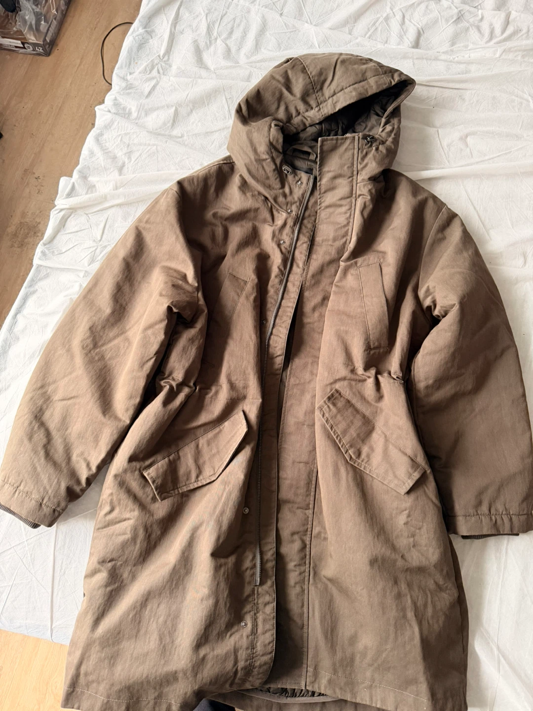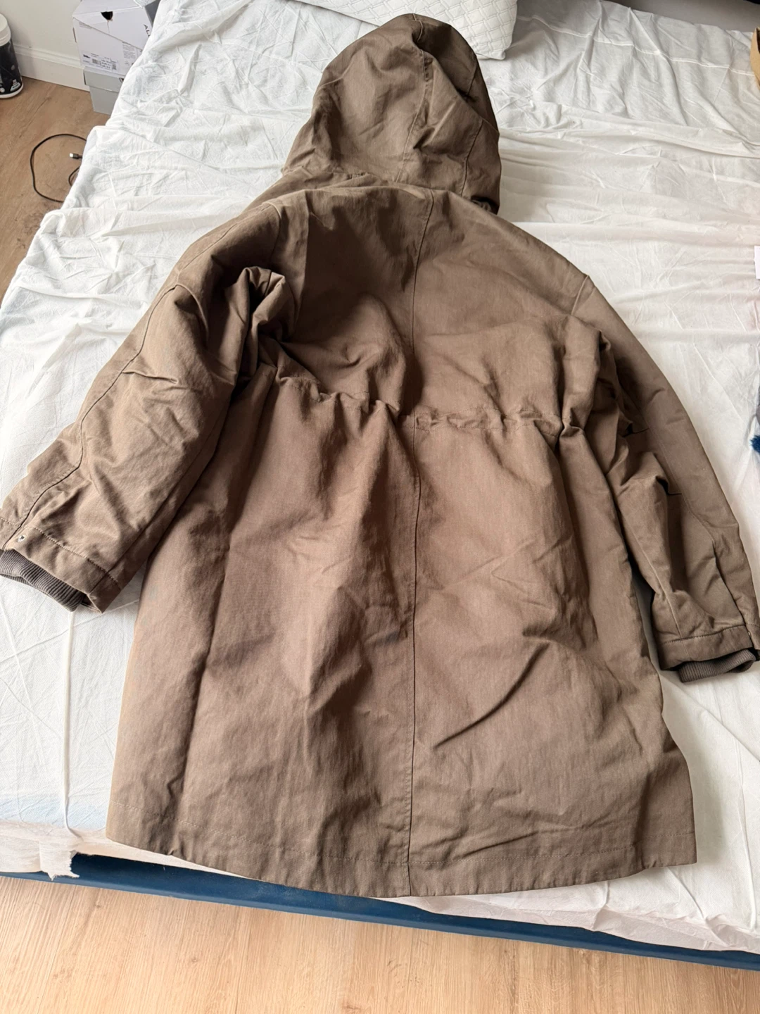 Selling a gently used H&M hooded parka in a versatile brown color! It's a size M and features a comfortable, relaxed fit. Originally bought for $19, this parka is perfect for layering during cooler weather. It has a hood and several pockets, making it both stylish and practical!