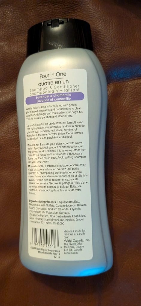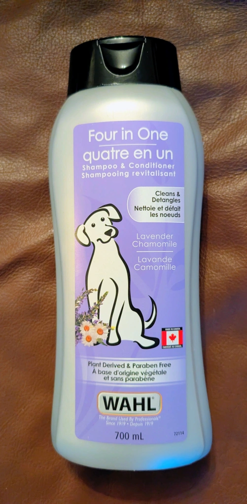 42Looking to keep your furry friend clean and smelling great? This Wahl Four in One shampoo and conditioner in Lavender Chamomile is just the thing! It's a gentle, plant-based cleanser that conditions and moisturizes your dog's fur. Plus, it's paraben and alcohol-free and comes in a 700mL bottle my puppy is low maintenance only used few times.local pu oshawa
