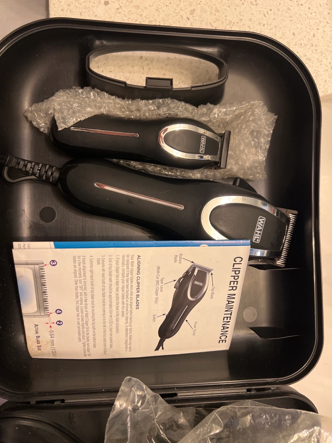 58Only used once in box, Wahl home haircutting kit. Includes two clippers, attachments, and carrying case. Ideal for home use and also travel.