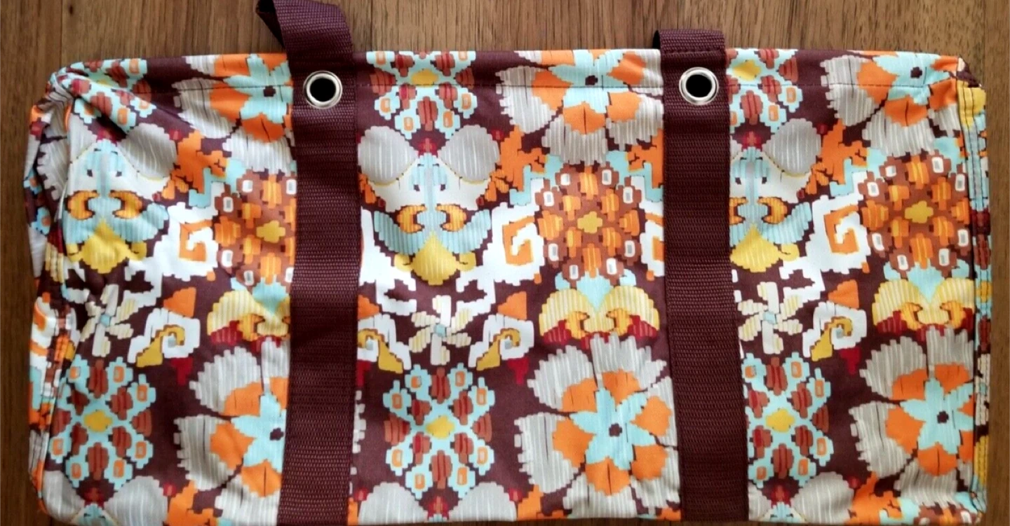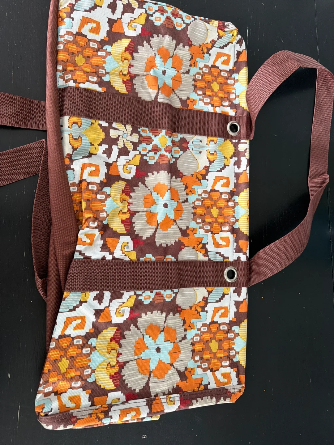 Thirty-One large utility tote in tapestry pattern. It has two sturdy brown carrying straps and a shoulder strap. Large utility totes were always best sellers- grab one at a great price!