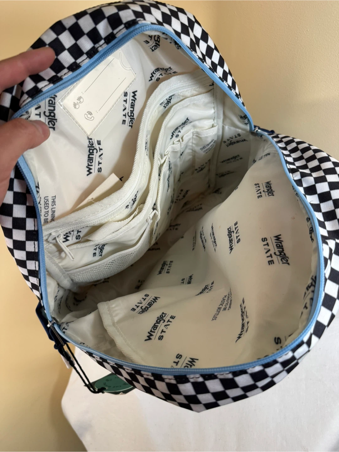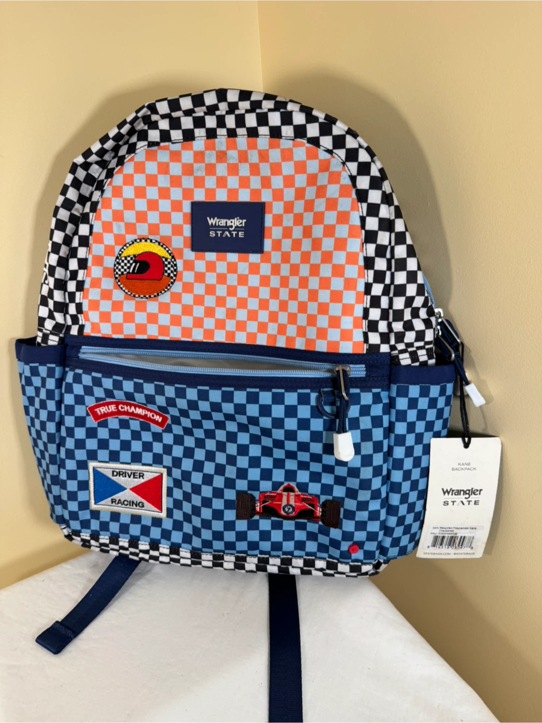 This Wrangler State backpack features a fun racing checkered pattern. It has multiple compartments inside for organization. Great for kids or anyone who loves a bold design!