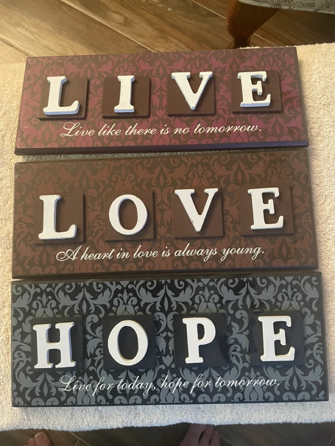 124Must go - Decluttering. I'm selling a set of three wall art decor pieces. Each one features a different inspirational word: LIVE, LOVE, and HOPE. They're in good condition and ready to add a touch of positivity to your home. Pick up is Jane and Lawrence in North York. Cash only. Message if interested.