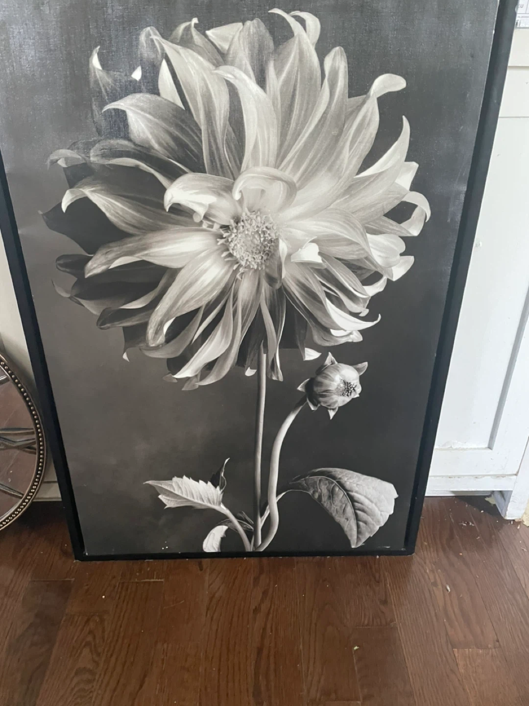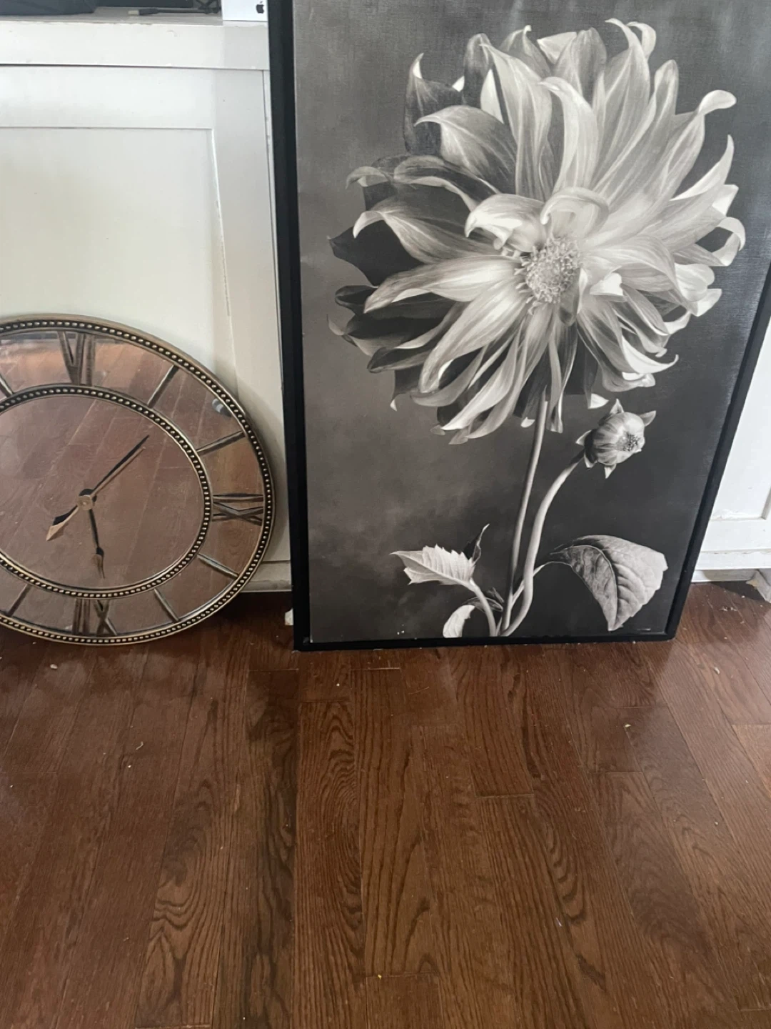 Selling a framed black and white flower print and a decorative wall clock. Both are in great condition and would look lovely in any room! Both r $20