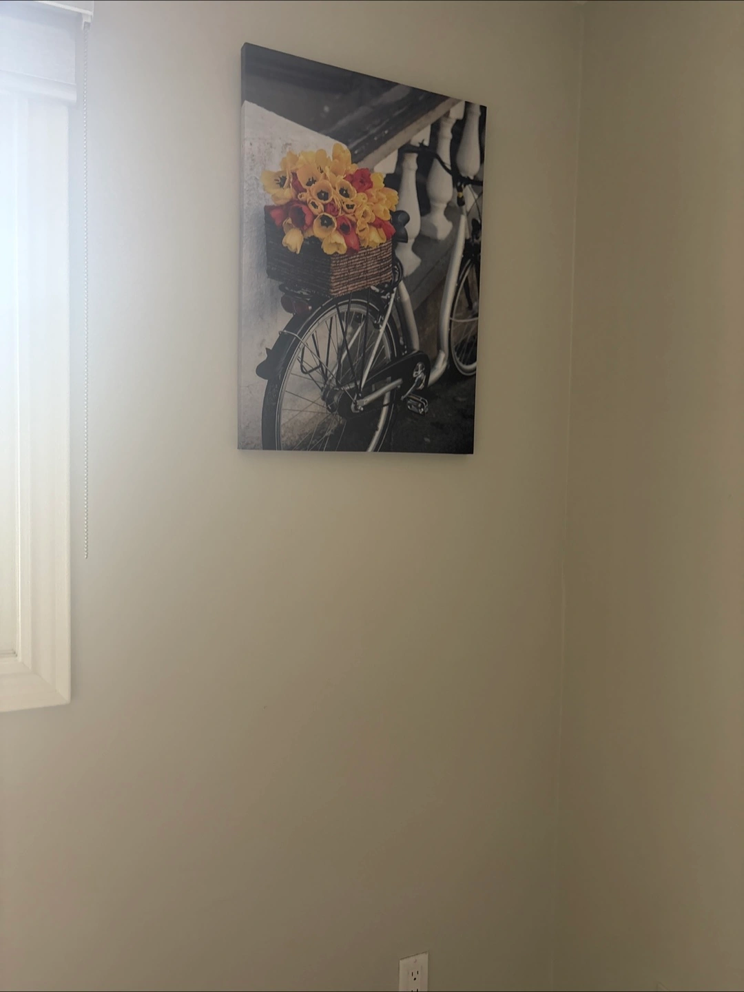Print of a bike with a basket of flowers. The wall art is hung on a wall. Hang it in your home for a relaxing and comforting feeling💚