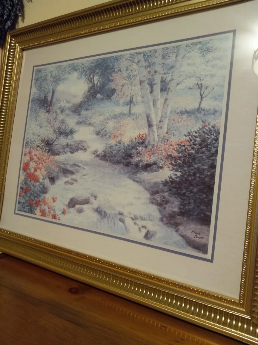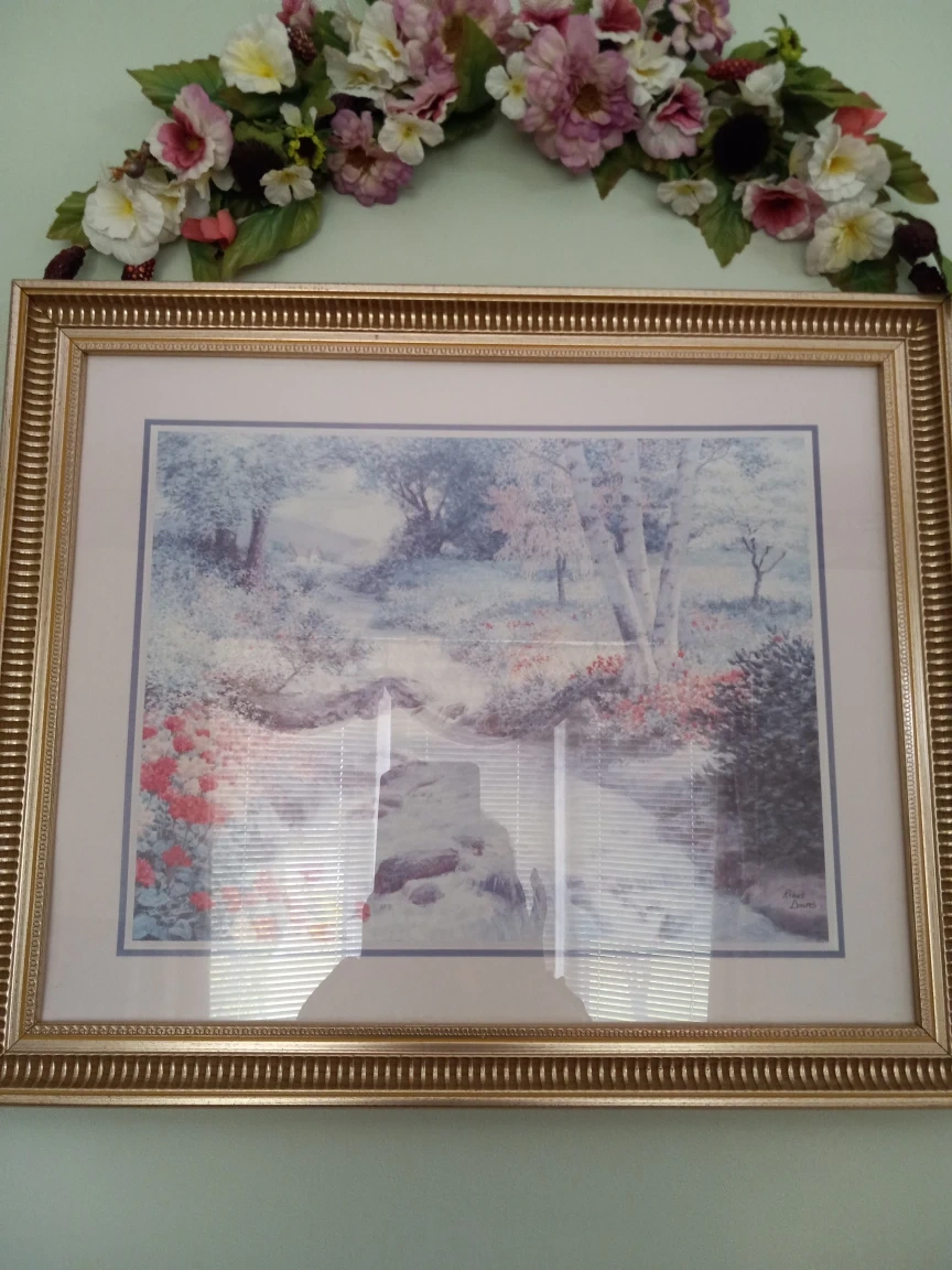 Summer scenery, with beautiful gold frame. 23x19 inches. With top matching color silk flower swag included $20. Pick up near Kennedy and Eglinton in Scarborough.