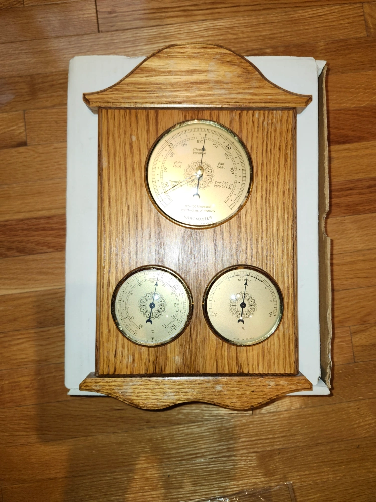 Vintage Baromaster Wood Hanging Weather Station. Display: Temperature, Barometer and Hygrometer. Made in France.