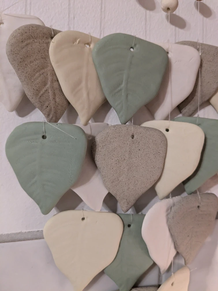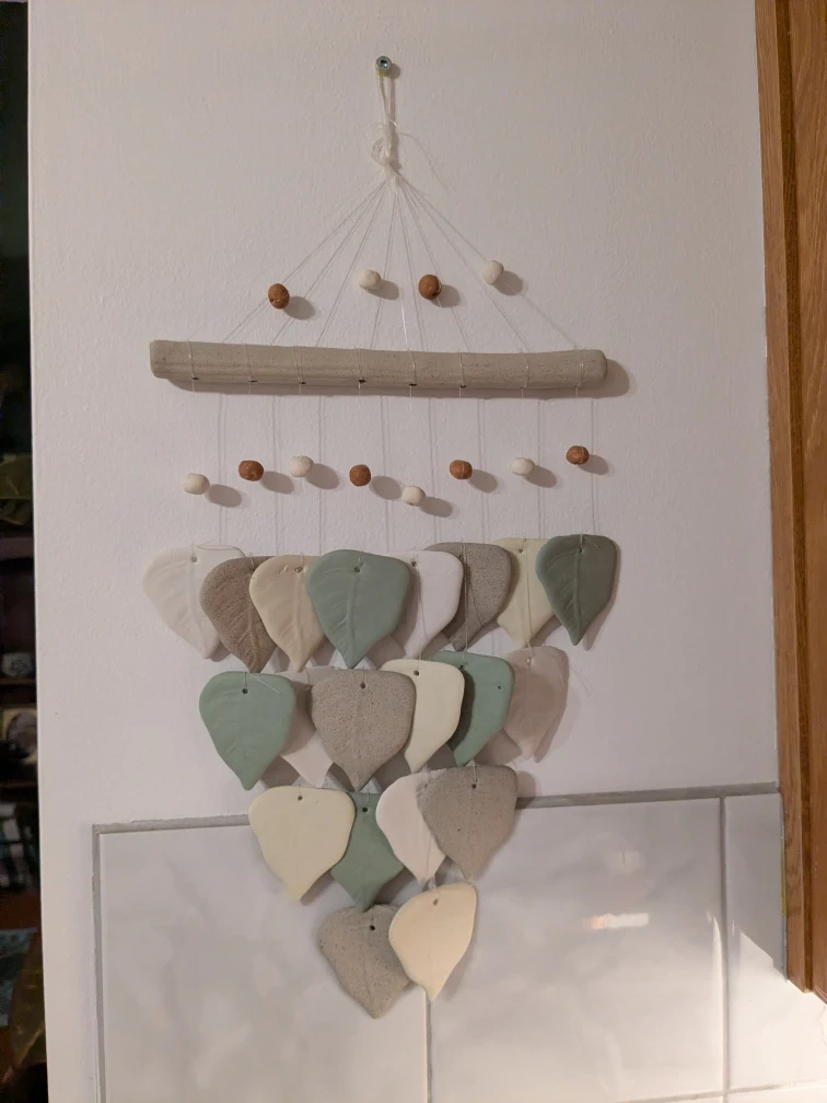 This was a gift from Thailand I believe, over 10 years ago, but it no longer works with our decor. It looks particularly beautiful in a baby's nursery or a bedroom...can go anywhere! It's made of a delicate clay or pottery, so while it sounds nice when the leaves chime, I think it's too fragile to be blowing around outdoors.