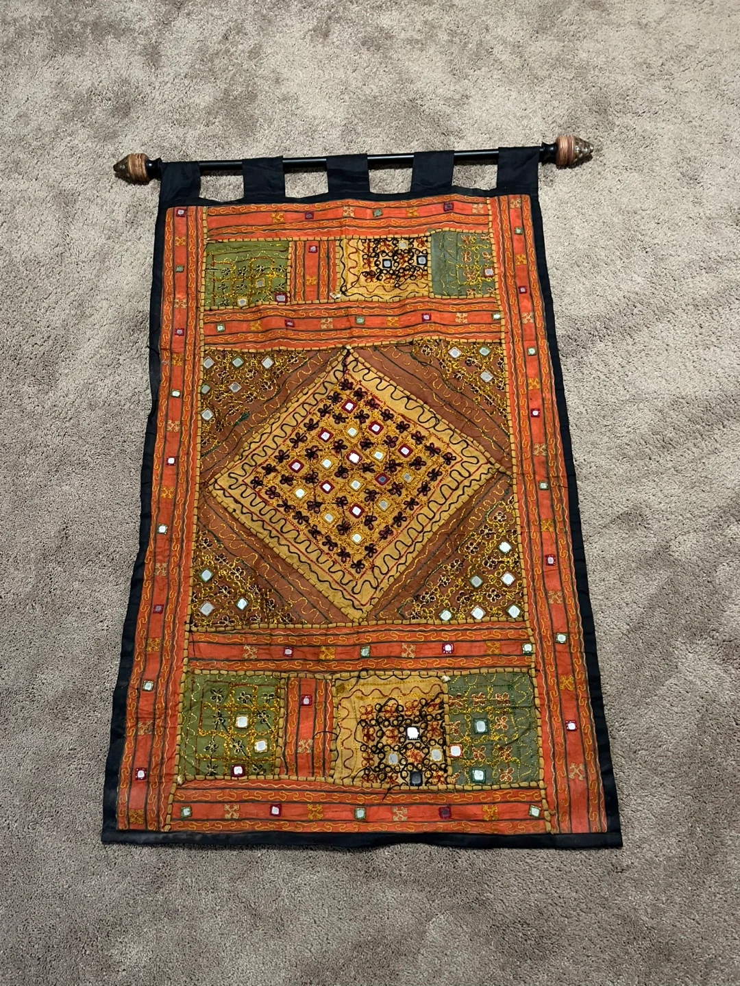 Unique wall hanging featuring a vibrant mix of orange, green, and brown tones. It has intricate patterns and small mirror accents