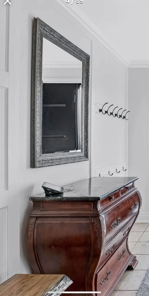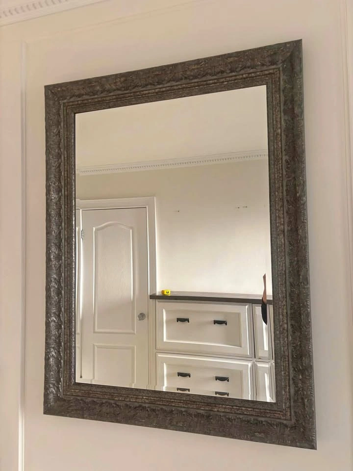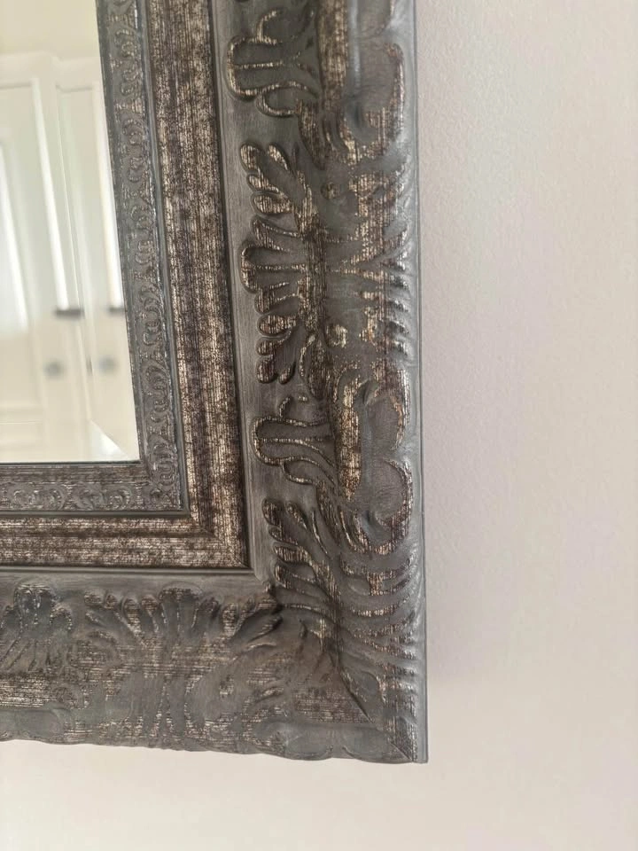 Decorative mirror with Pewter(dark grey) frame with gold bronzing detail. 31”x41”. From pet free non-smoking home.