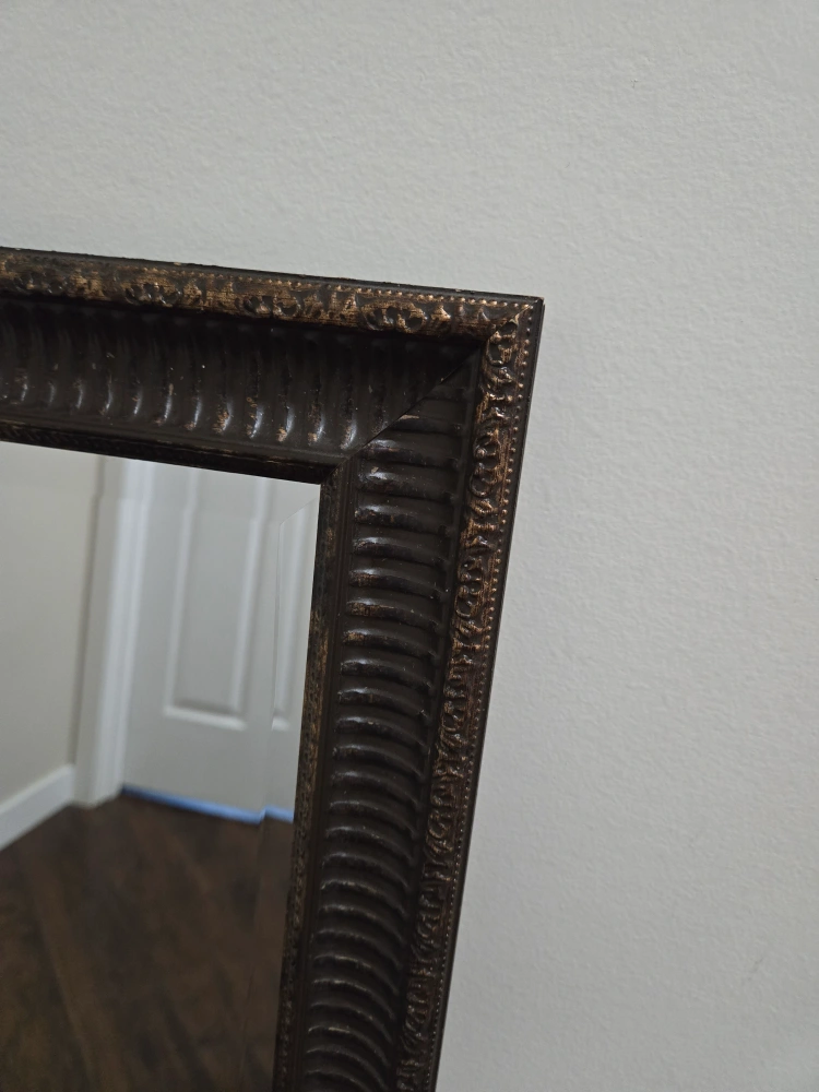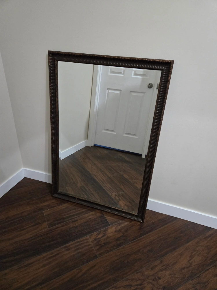 27.5" x 39.5" Beveled mirror with frame and wire hanger. In perfect condition.