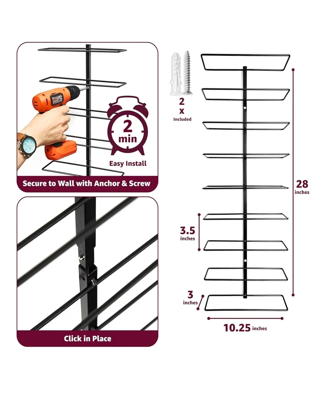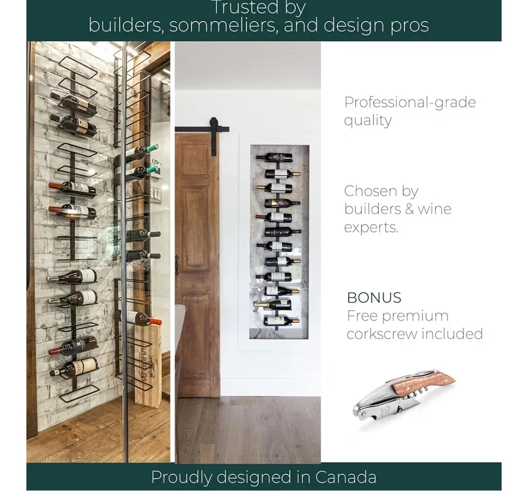 26Brand New Original Price on Amazon.ca: $124+tax=$140 Selling Price: $40 Mounting type: Wall Mount Colour: Black Size: 9 bottles Material: Alloy Steel Product Dimensions: 7.6D x 22.8W x 96.5H Centimetres DIMENSIONS & BOTTLE CAPACITY (9 bottles): the size of the wall mounted wine rack is 38.5” H x 9.5” W x 3.75” D. This wall mounted wine rack hold up to 9 bottles of Bordeaux style bottle (750ml, 13’’ L x 3-3/8’’ diameter. STYLISH AND MINIMALIST DESIGN: this wall mounted metal wine rack provides a storage solution for a wide range of height and bottle size. This wall mounted wine rack is designed in a way that bottle label is always visible. Your wine bottle collection deserves to be easily displayed to impress your guests and start a good conversation around a glass of wine. QUALITY MATERIAL AND PAINT: This wall mounted wine rack is built with high quality steel and covered with industrial powder coat paint satin black finish to meet highest standards for residential or commercial utilisation. INSTALLATION: This wall mounted wine rack is for DIYers and for professionals. The design of this wine rack provides easy and intuitive installation. Anybody with a screwdriver can install this wall mounted wine rack in minutes.