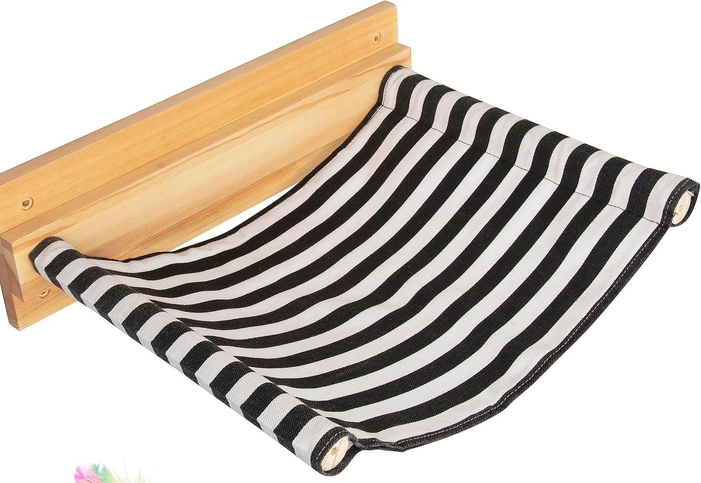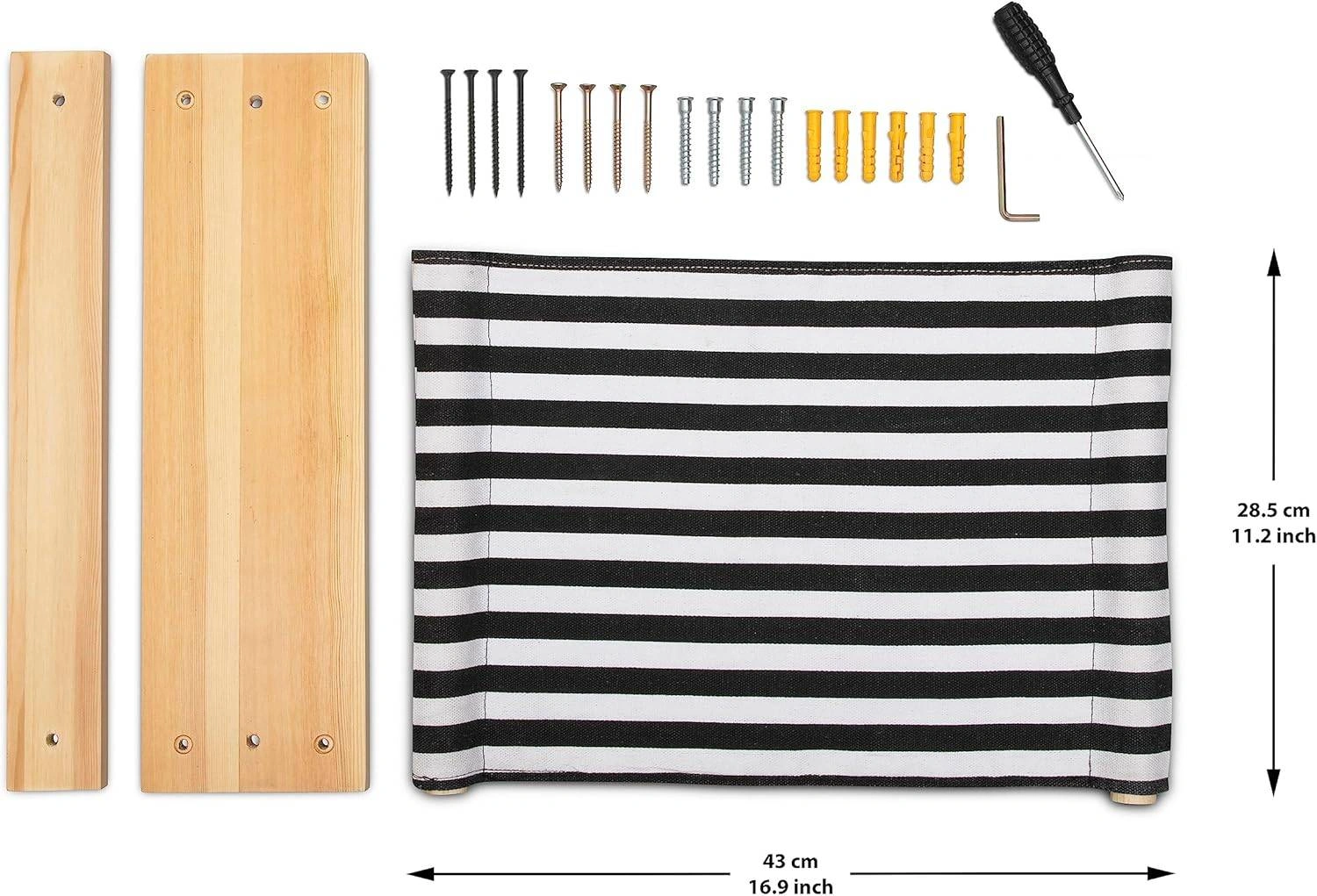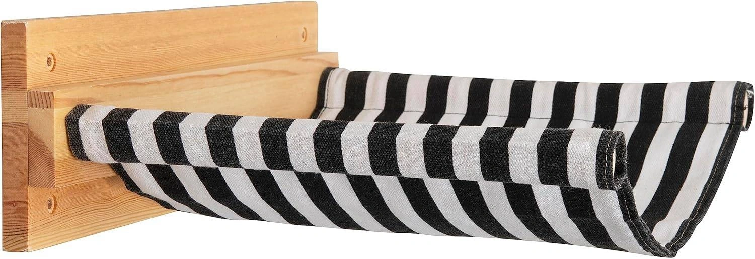 Colour Black, White Material Wood Product care instructions Machine Wash Product Dimensions 39.9L x 34.8W x 11.9H Centimetres Manufacturer Qivutule Wall-mounted cat hammock - a fun and exciting piece of furniture for your cat to enjoy and relax in. Measures 15.7" x 13.8" and can hold up to 40 lbs. The black and white striped fabric is machine washable and can easily be removed to clean. Constructed from durable rubberwood, the eco-friendly and strong cat hammock is made to last. As the hammock is constructed from natural wood, each piece may vary slightly in appearance. All tools and instructions are included to make the installation process effortless and easy - the entire process shouldn't take longer than 30 minutes to complete