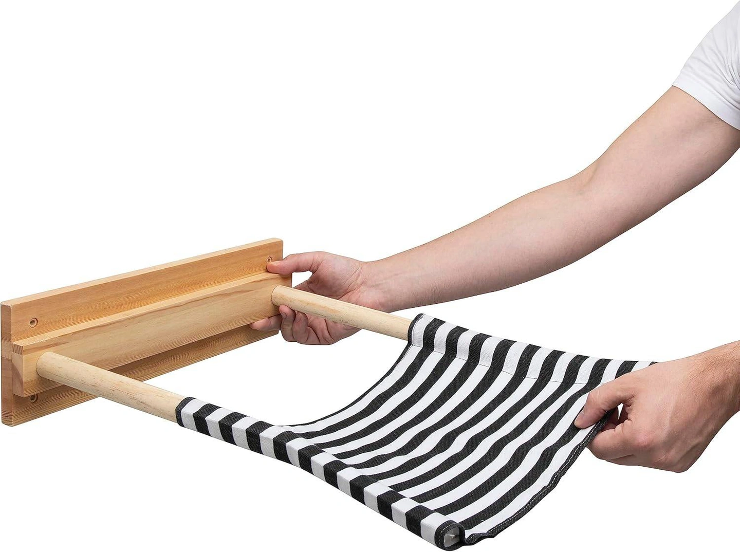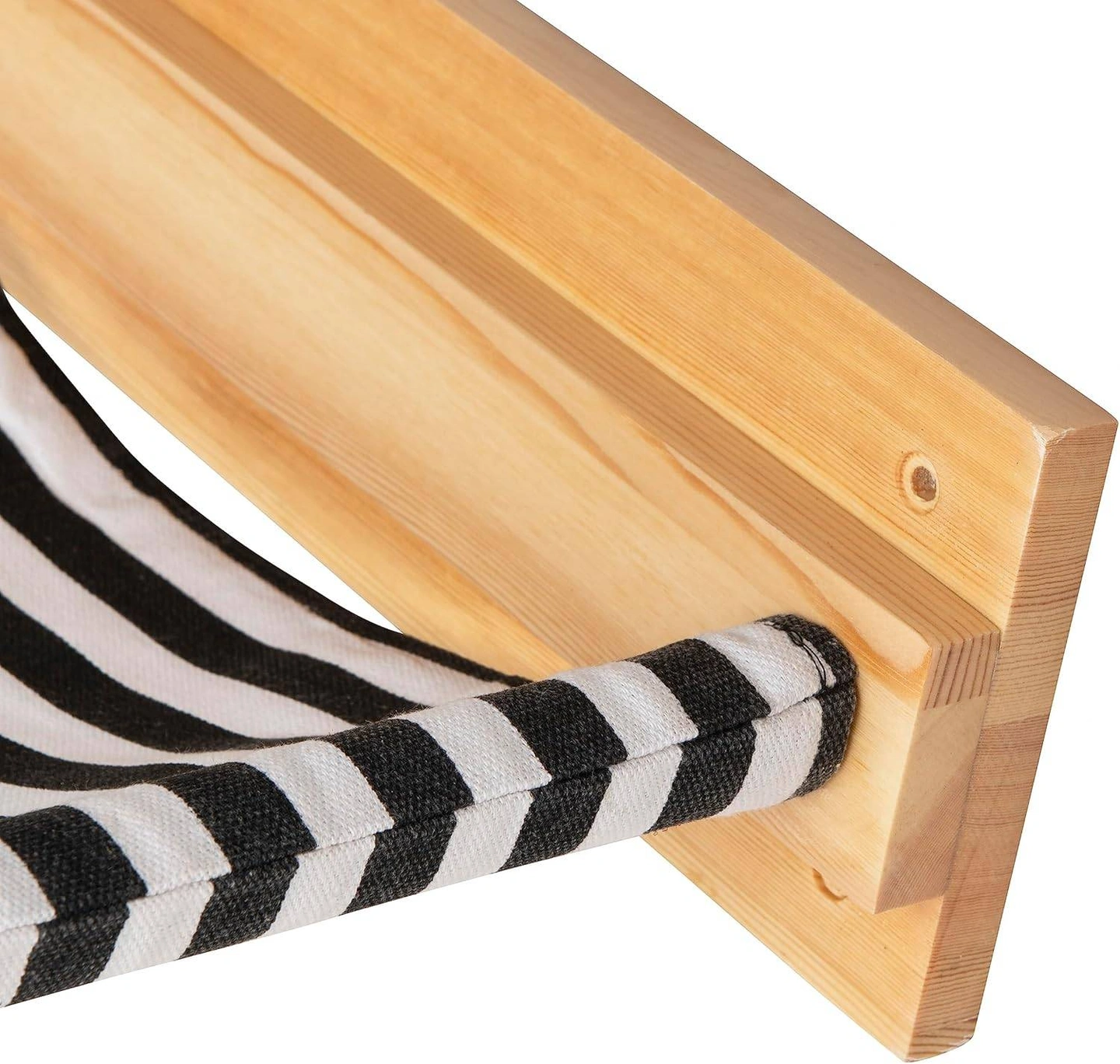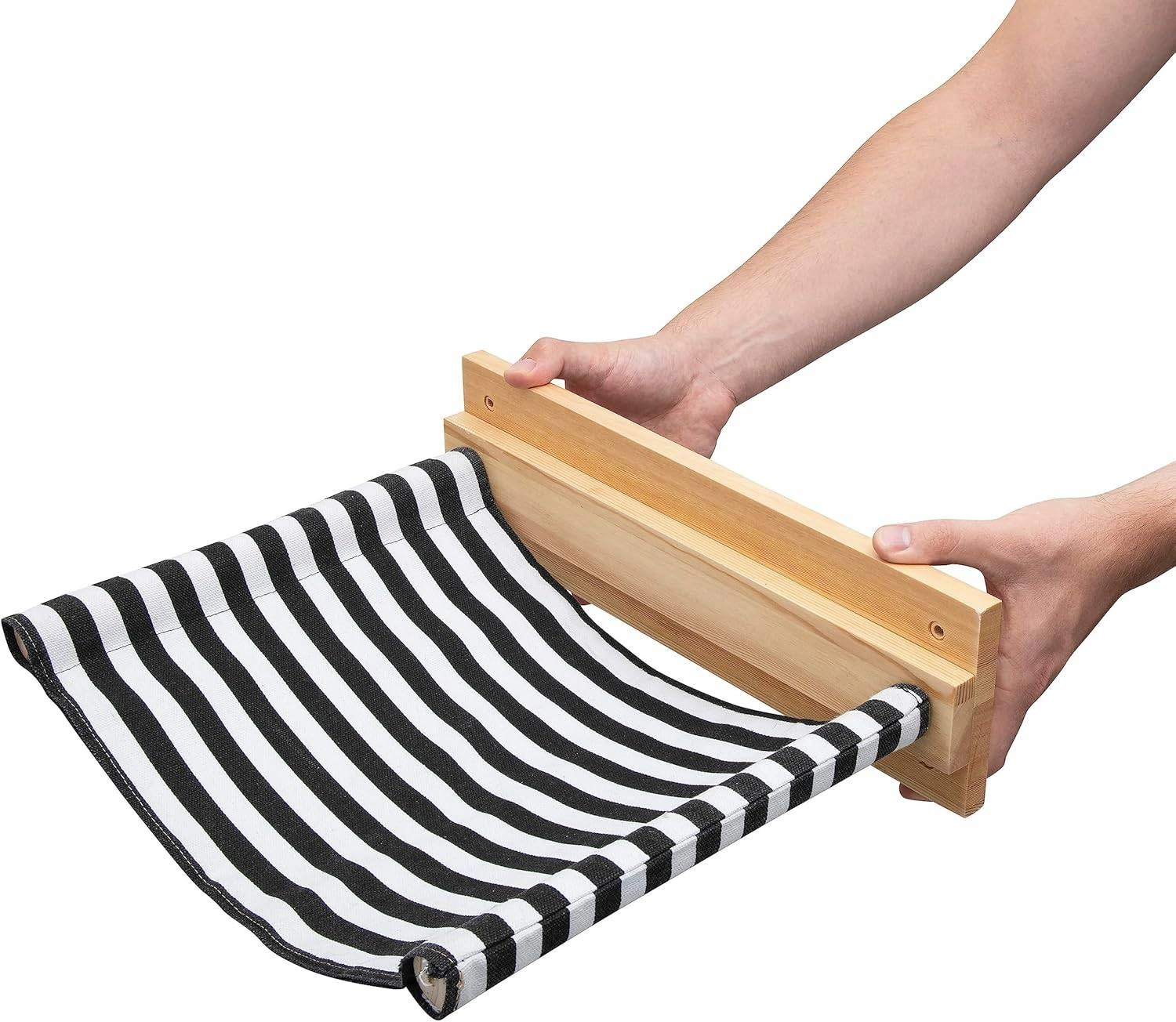 Colour Black, White Material Wood Product care instructions Machine Wash Product Dimensions 39.9L x 34.8W x 11.9H Centimetres Manufacturer Qivutule Wall-mounted cat hammock - a fun and exciting piece of furniture for your cat to enjoy and relax in. Measures 15.7" x 13.8" and can hold up to 40 lbs. The black and white striped fabric is machine washable and can easily be removed to clean. Constructed from durable rubberwood, the eco-friendly and strong cat hammock is made to last. As the hammock is constructed from natural wood, each piece may vary slightly in appearance. All tools and instructions are included to make the installation process effortless and easy - the entire process shouldn't take longer than 30 minutes to complete