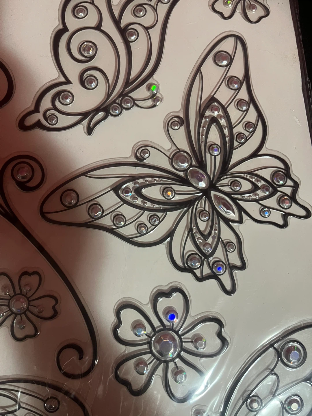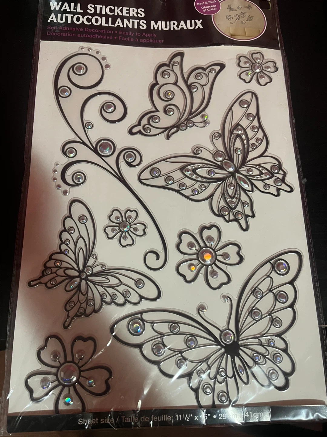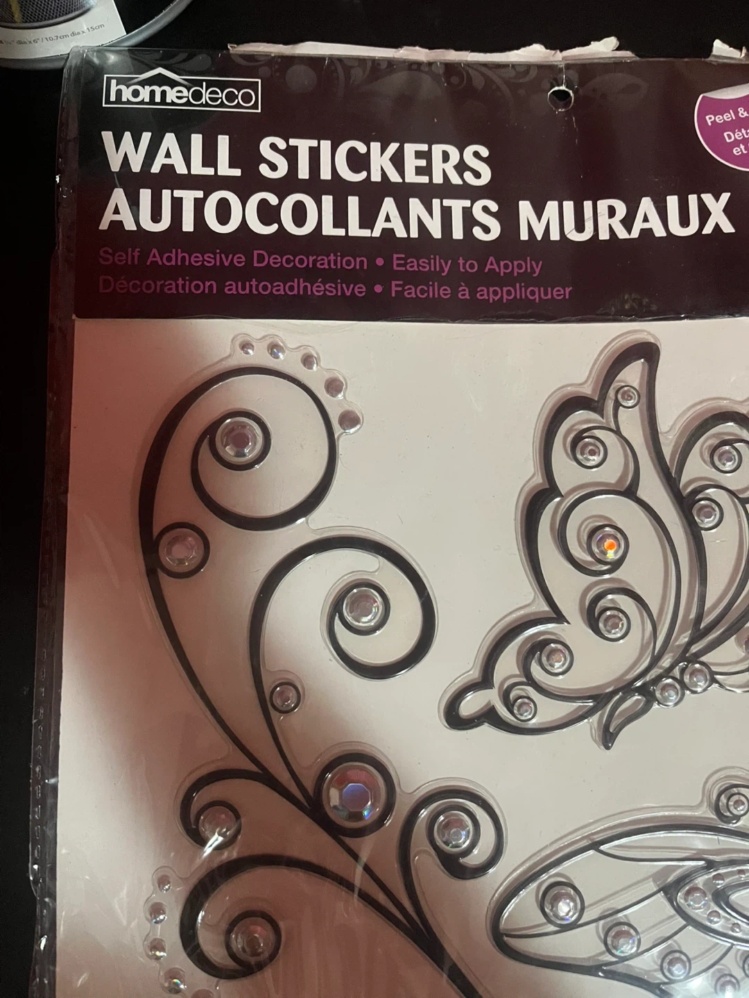 10Add a touch of sparkle to your walls with these Home Deco wall stickers! They feature a beautiful butterfly and floral design with gem accents. Easy to apply for a quick and stylish decoration!