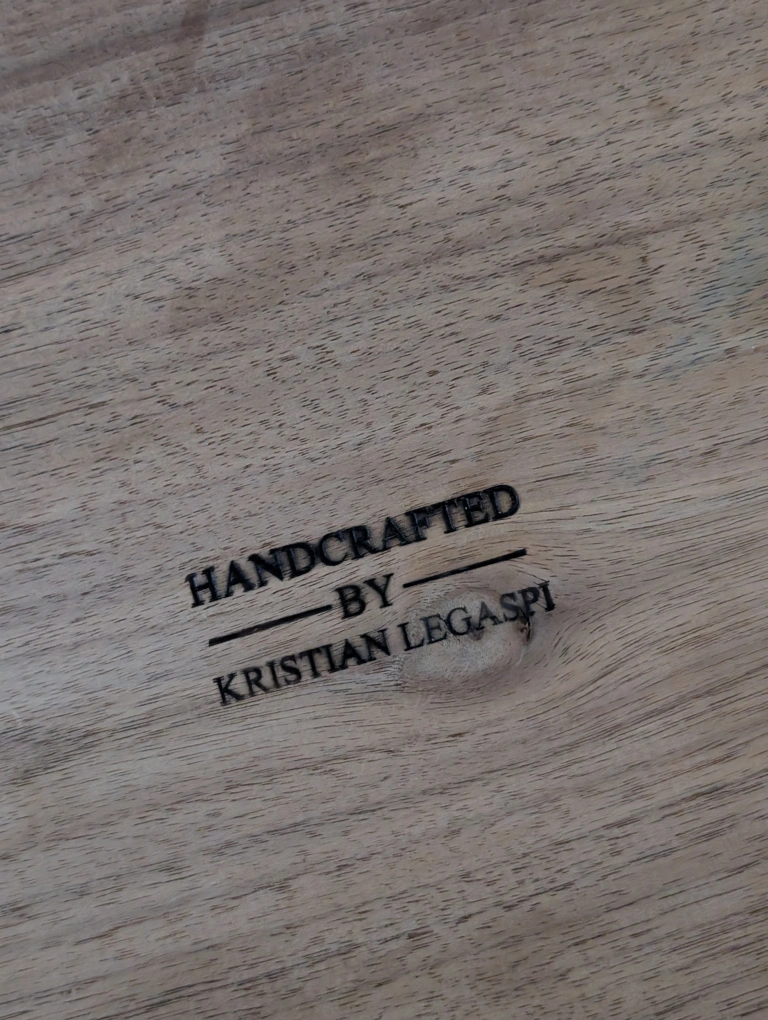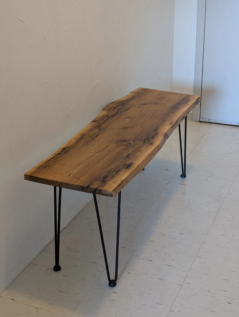 Selling a handcrafted bench by Kristian Legaspi. It's a beautiful piece that would look great in any home! Black walnut 43.5" L x 13.5-15" W x 17" H 1" thick black hairpin heavy duty legs Canadian hardwood sanded to 240 grit polyurethane finish treated wood kiln dried contemporary design lasts year's to decades