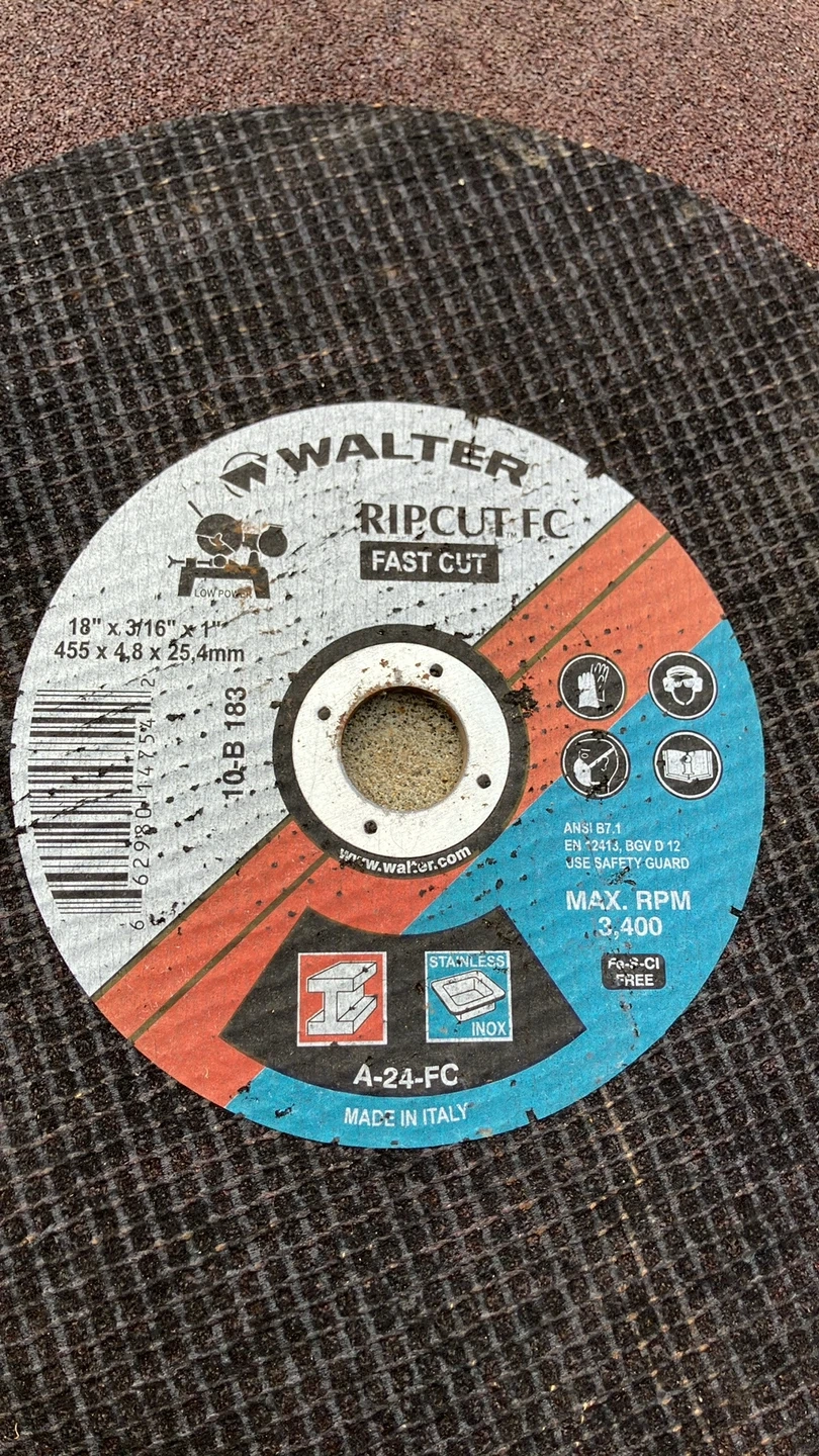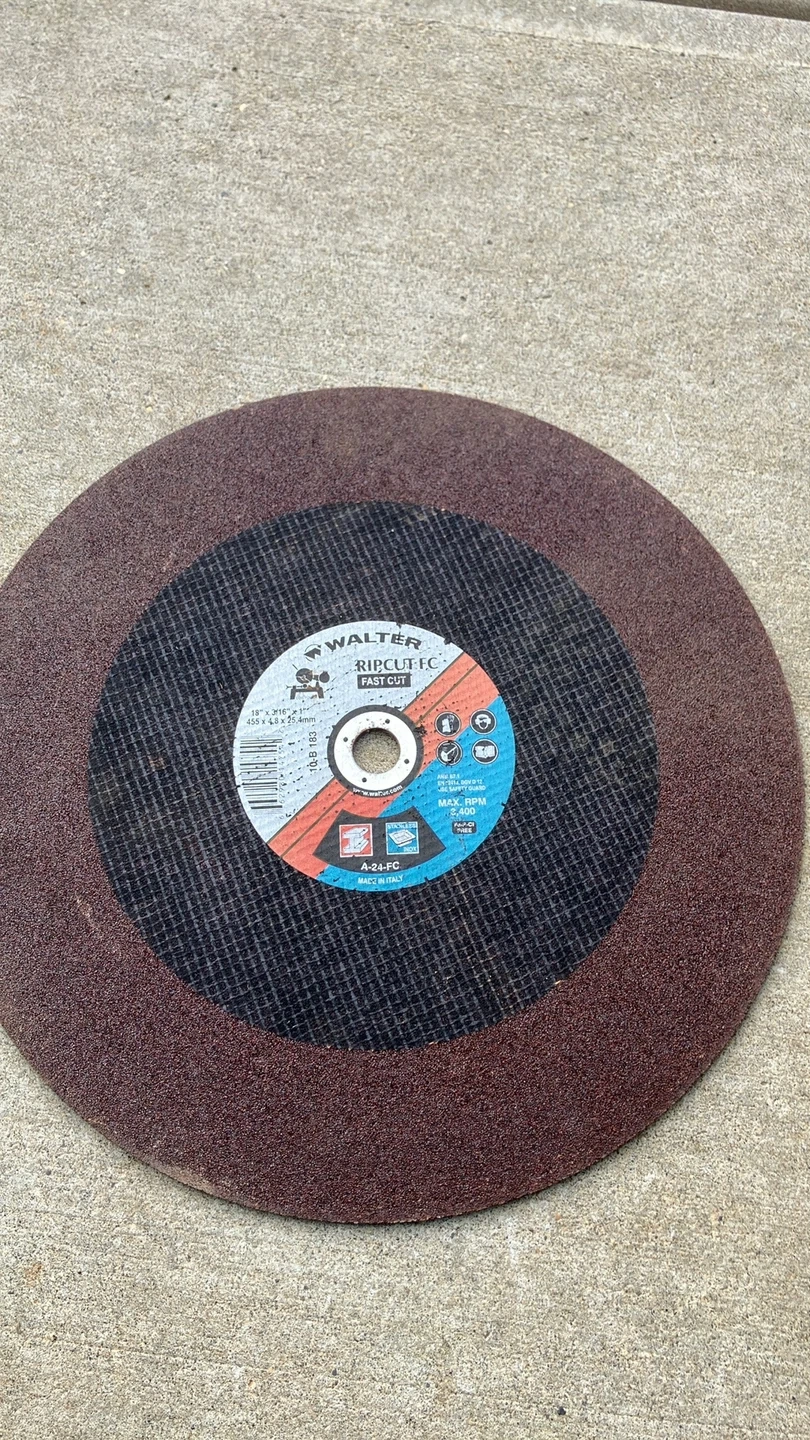 Selling a Walter Ripcut F.C. Fast Cut cutting wheel. It's 18 inches in diameter and 3/16 inches thick. It's designed for fast cutting and has a maximum RPM of 3,400. Made in Italy Have 9 available Location: Leduc but can deliver past Edmonton for a small fee