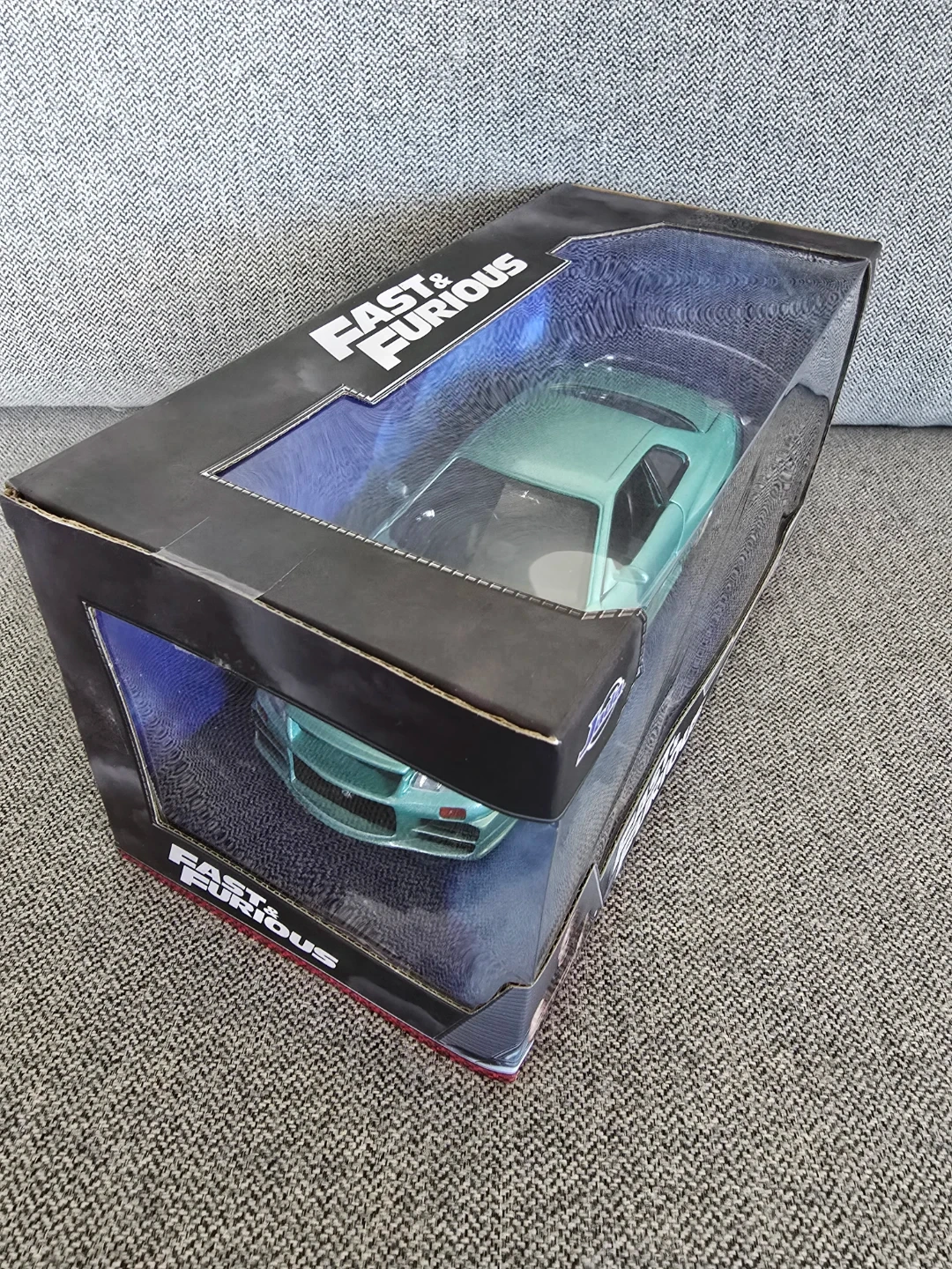 This is a Jada die-cast model of Brian's Nissan Skyline GT-R R34 from the Fast & Furious franchise. It's a detailed replica in a cool teal colour. The car comes in its original box, ready for display or play!