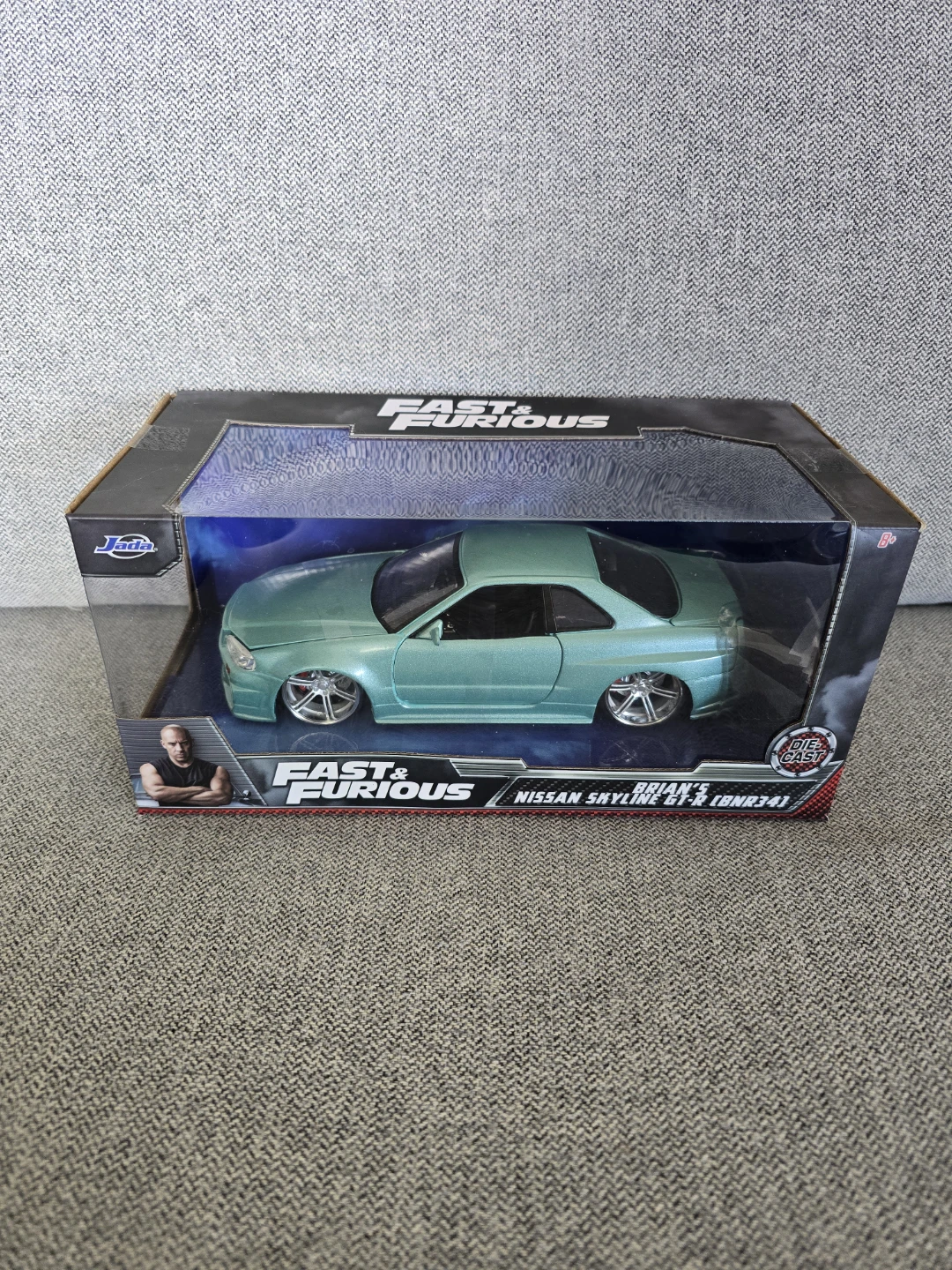 This is a Jada die-cast model of Brian's Nissan Skyline GT-R R34 from the Fast & Furious franchise. It's a detailed replica in a cool teal colour. The car comes in its original box, ready for display or play!