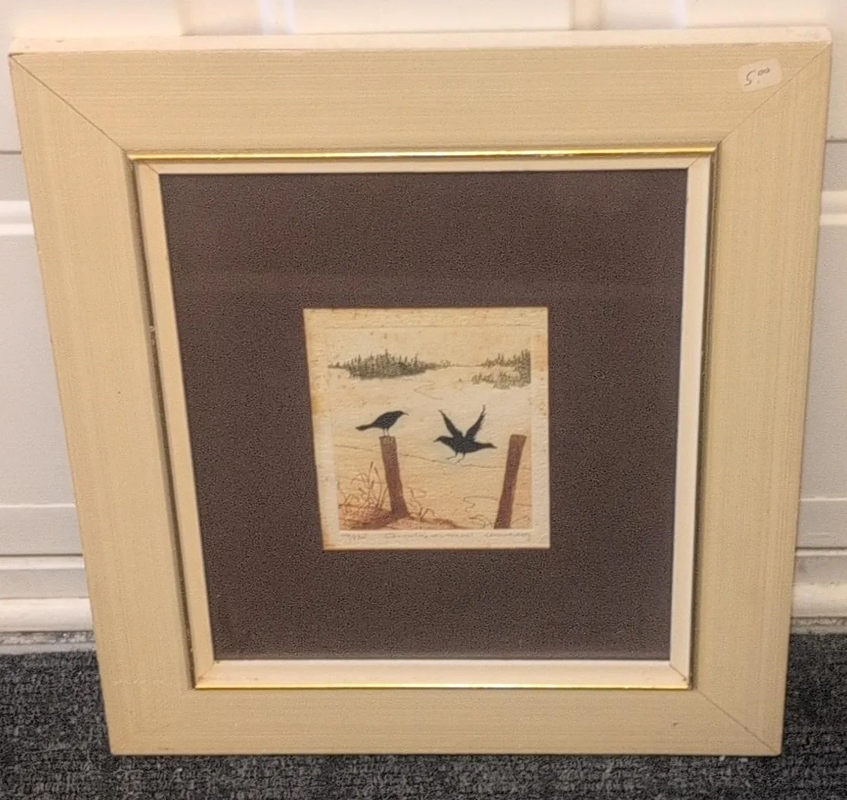 A framed print depicting two birds in a natural setting. It's matted with a dark brown background and a light-coloured frame. The artwork's size is small, suitable for accentuating a wall.