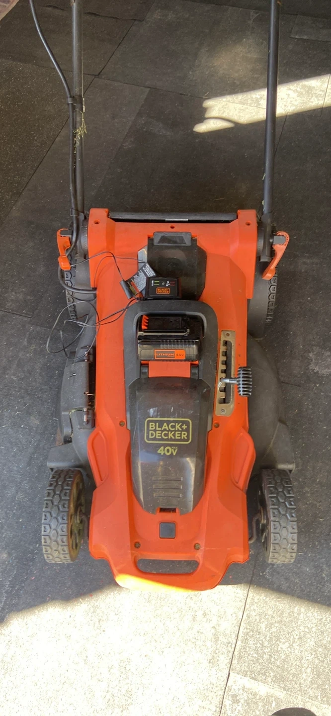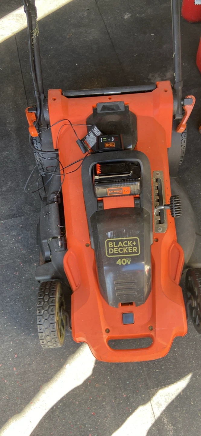 This is a Black+Decker 40V cordless lawn mower. It's orange and black. Includes the battery and charger. Great for keeping your lawn tidy! $85