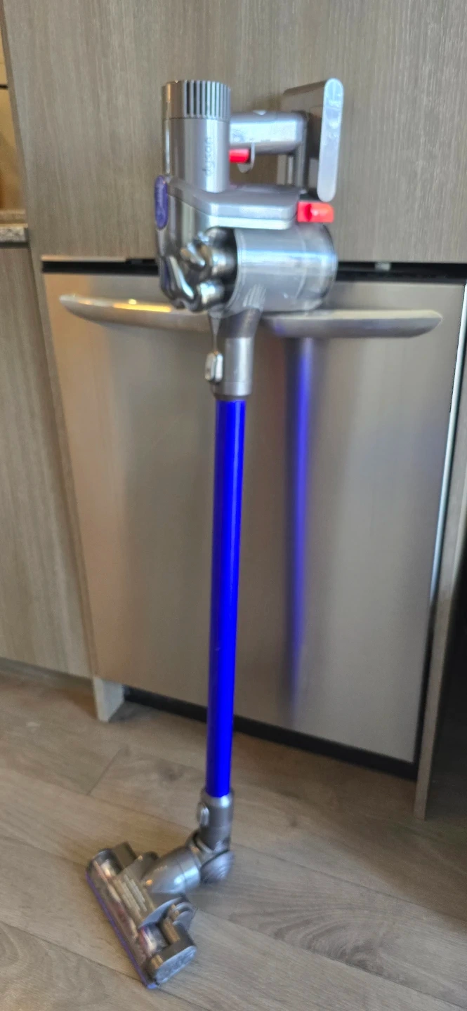 This is a Dyson DC45 Animal cordless vacuum cleaner with a blue wand. It features carbon fibre filaments on the cleaner head. It's great for keeping your floors tidy! This vacuum is excellent for pet owners.