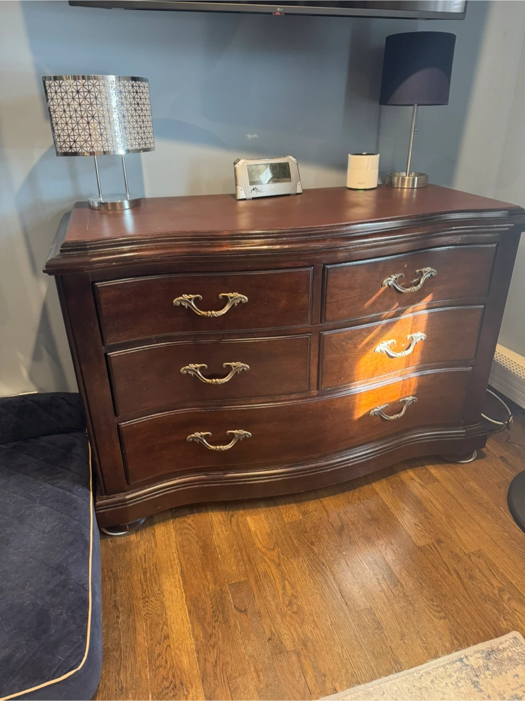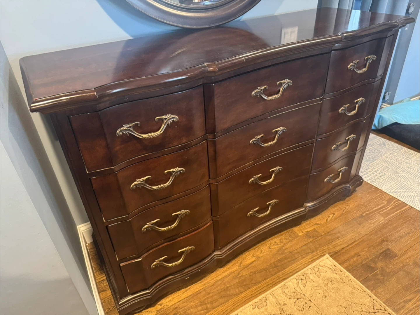 Bernhardt Furniture bought in 2008. 4 poster bed, (headboard, footboard and rails only) the posts can be changed to give you 3 sizes. This round mirror has a dark wood frame with ornate detailing. 12 drawer dresser with mirror and 5 drawer dresser. This was bottom half of an armoire. The top is painted. The set is in good condition with minor scratches from wear.