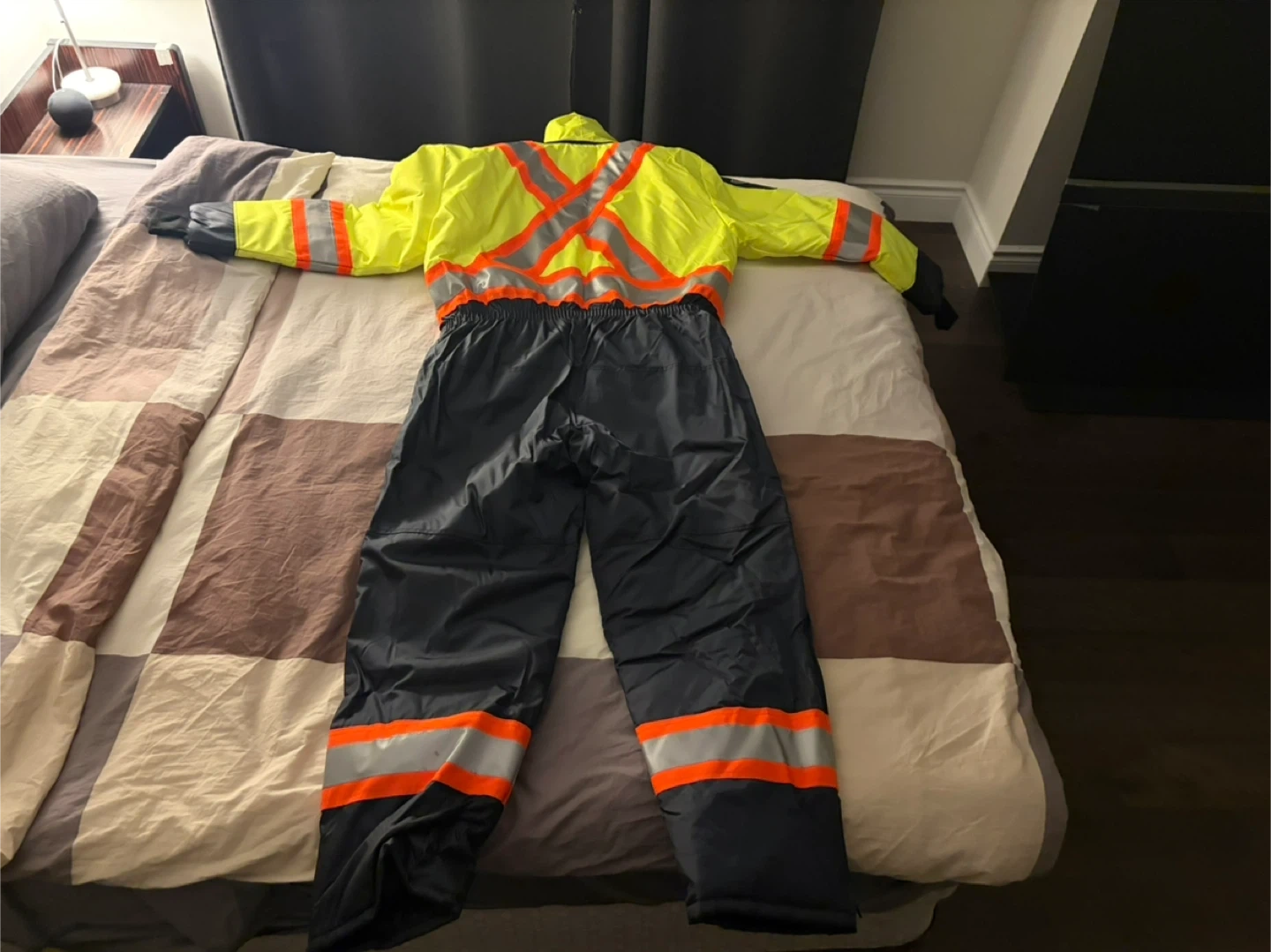 High-visibility insulated coveralls, size Large. Warm, durable, and perfect for construction or outdoor work. Reflective safety stripes. Good condition.