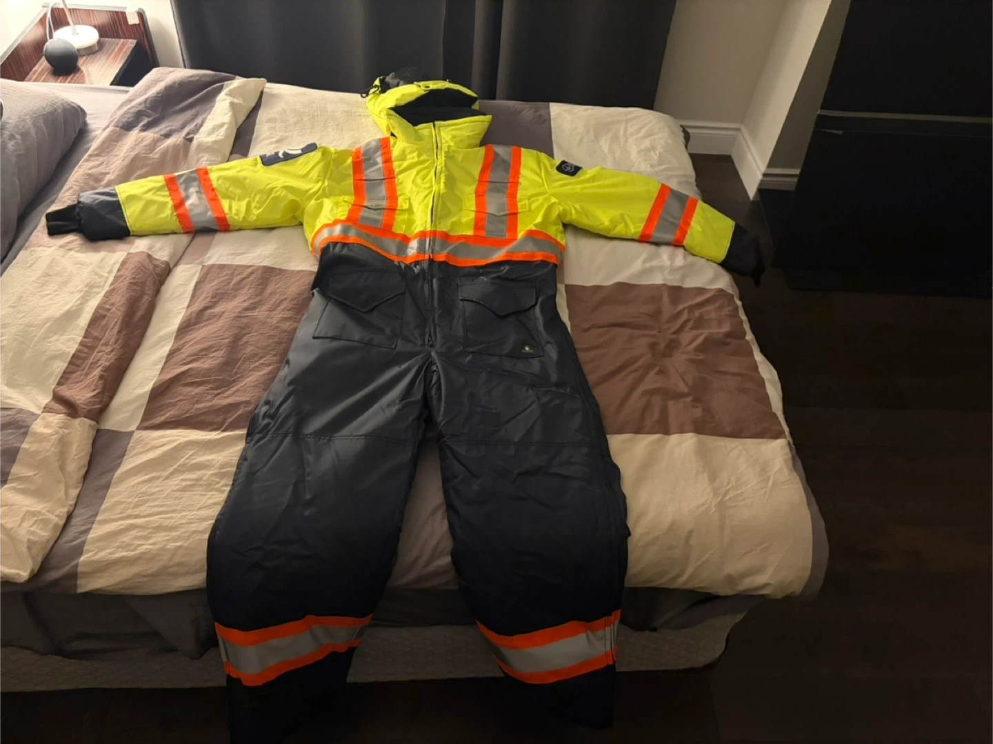 High-visibility insulated coveralls, size Large. Warm, durable, and perfect for construction or outdoor work. Reflective safety stripes. Good condition.