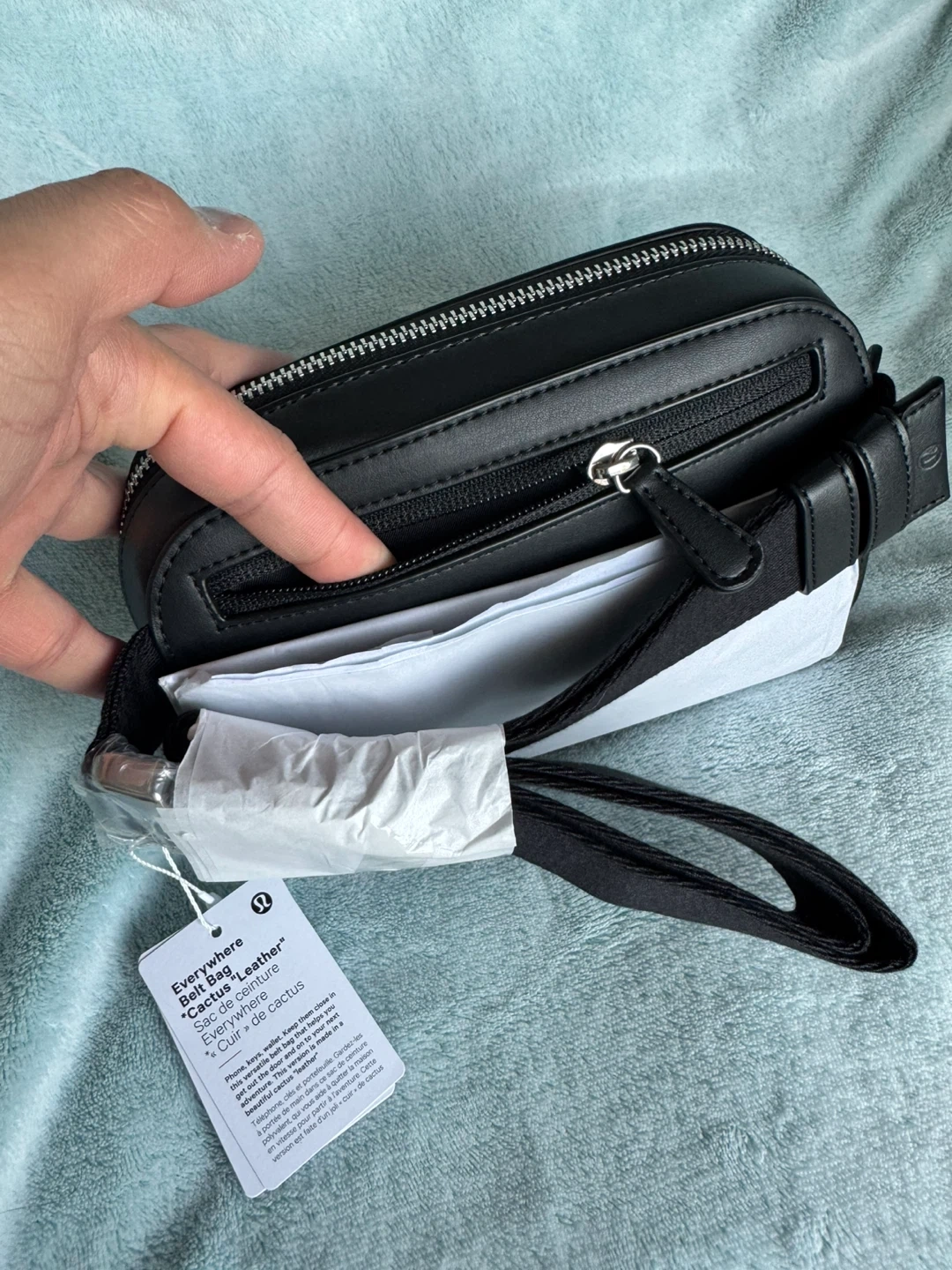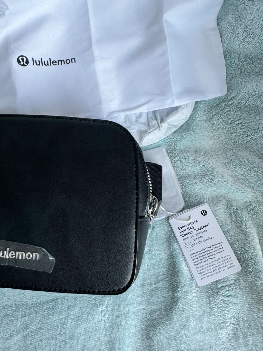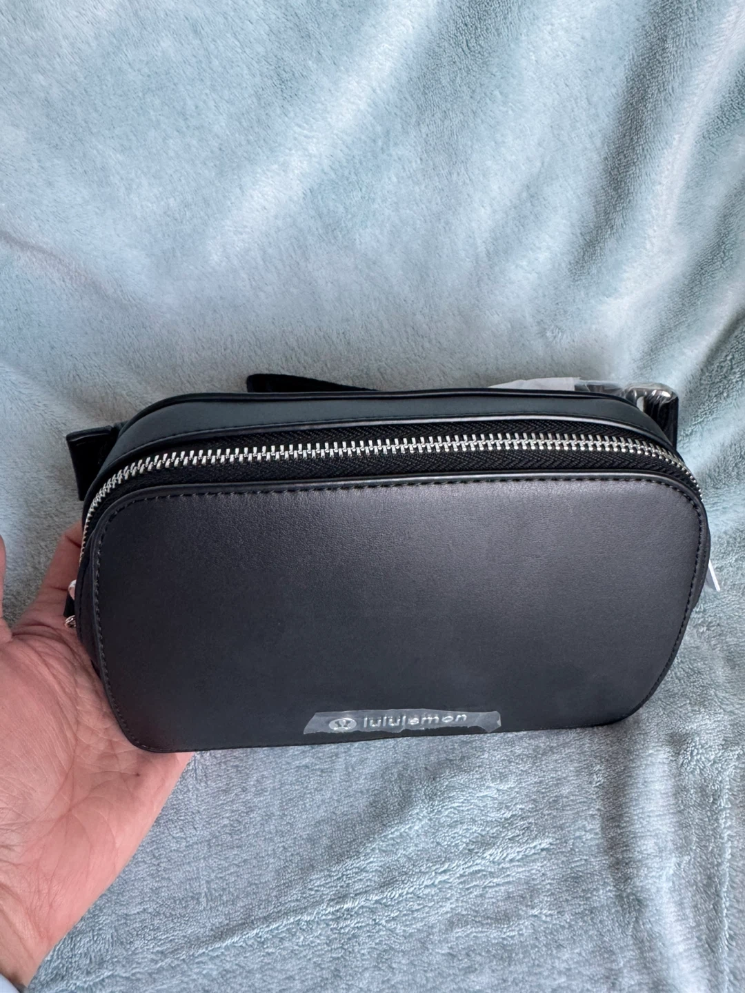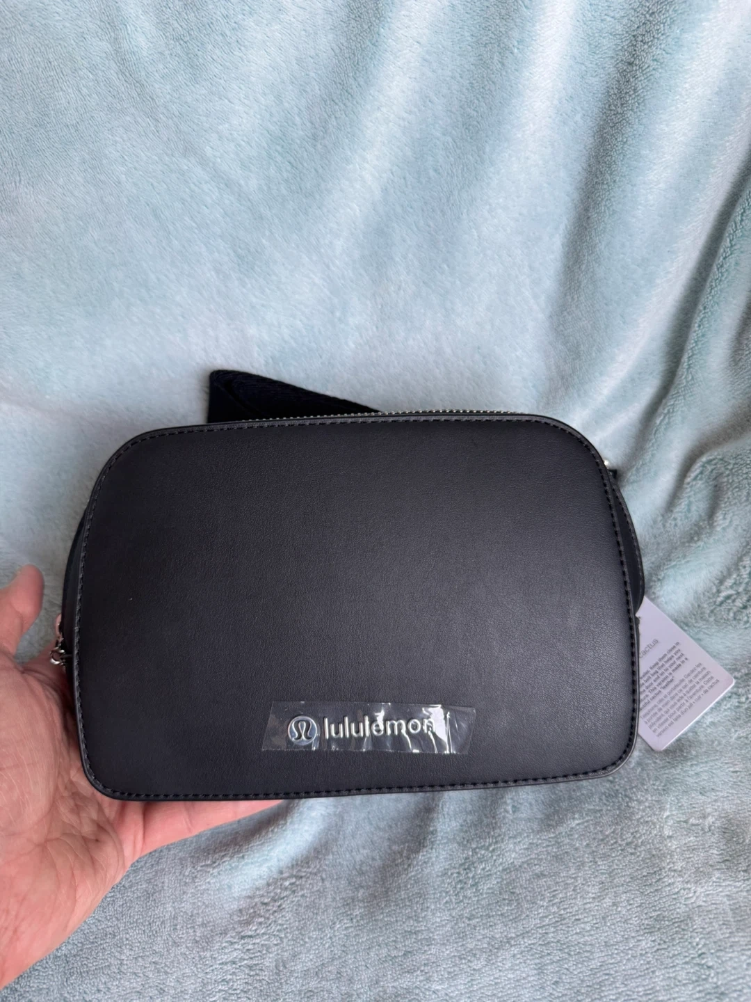 Lululemon Everywhere Belt Bag in black faux leather. It has a zippered main compartment and an adjustable strap. Includes dust bag.
