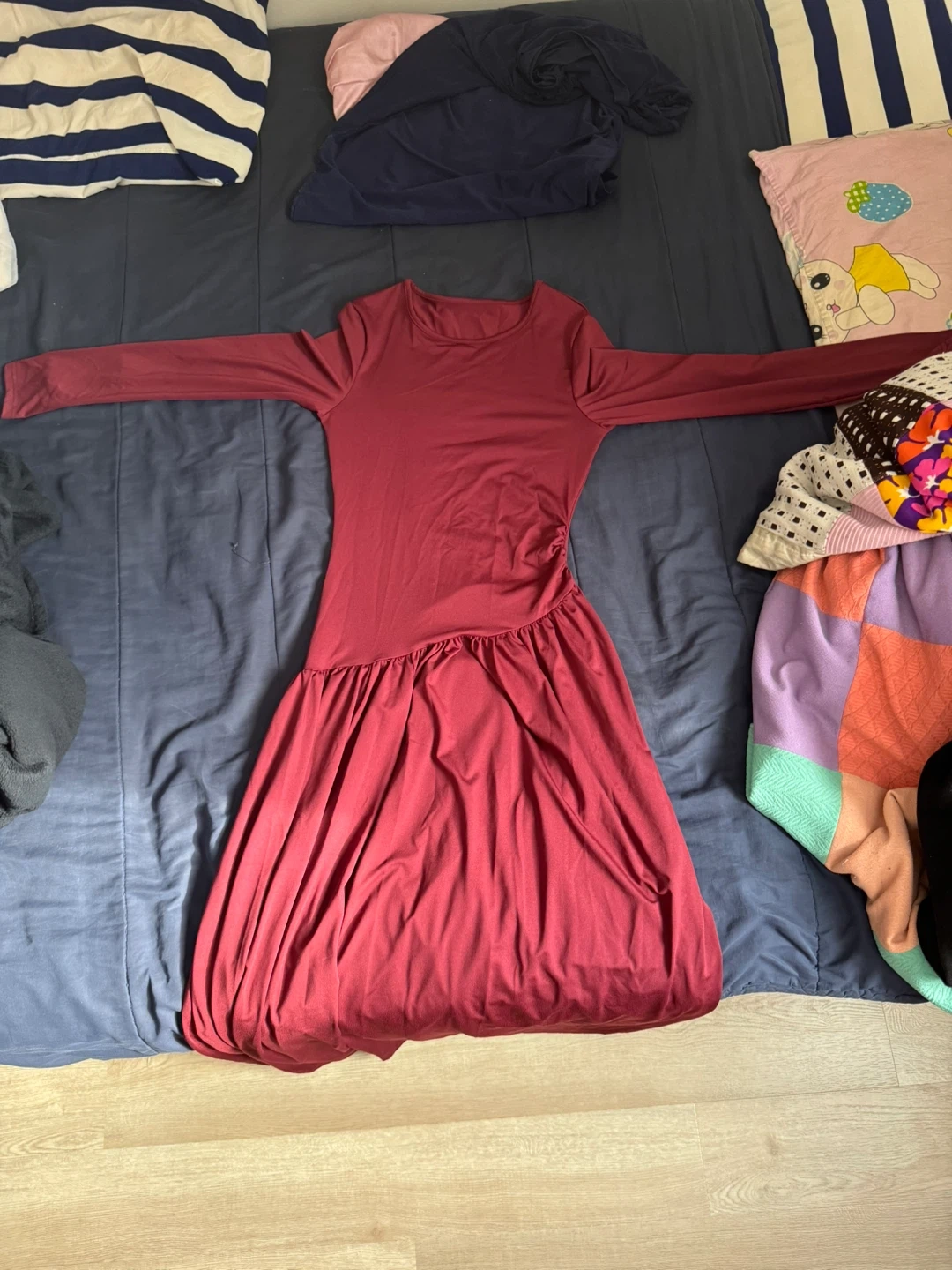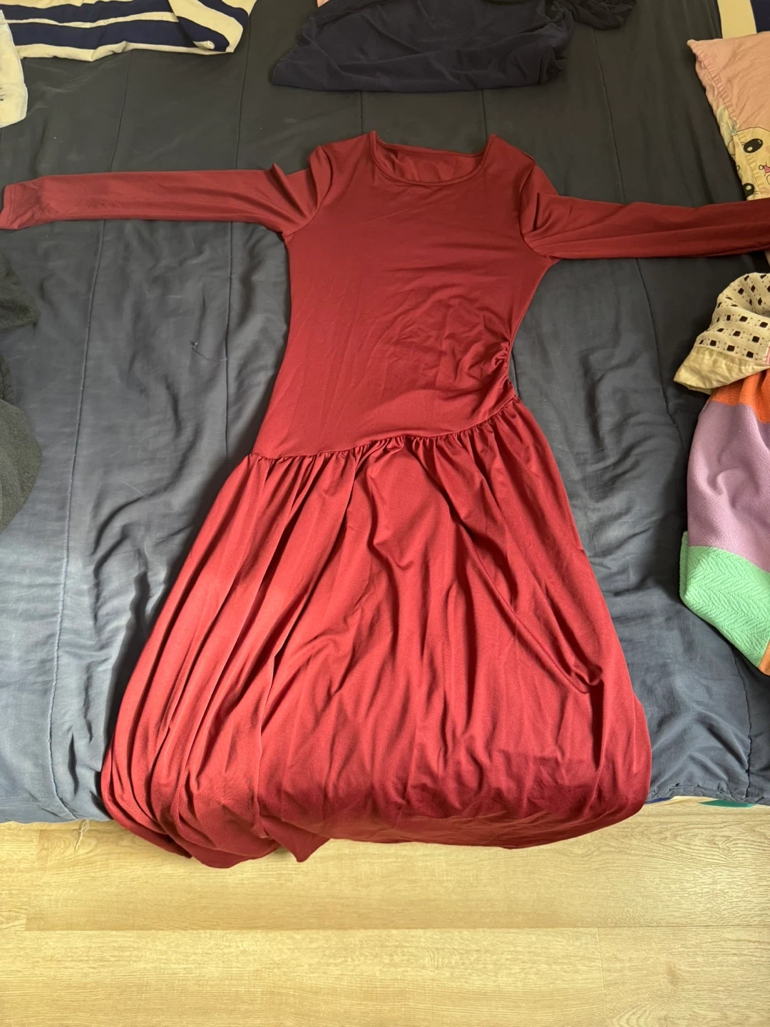This is a women's long-sleeve maxi dress in a rich burgundy colour. It features a comfortable, stretchy fabric and a flattering gathered waistline that flows into a full skirt. It's suitable for casual wear or can be dressed up for evenings out.