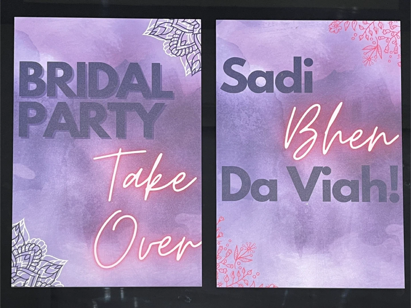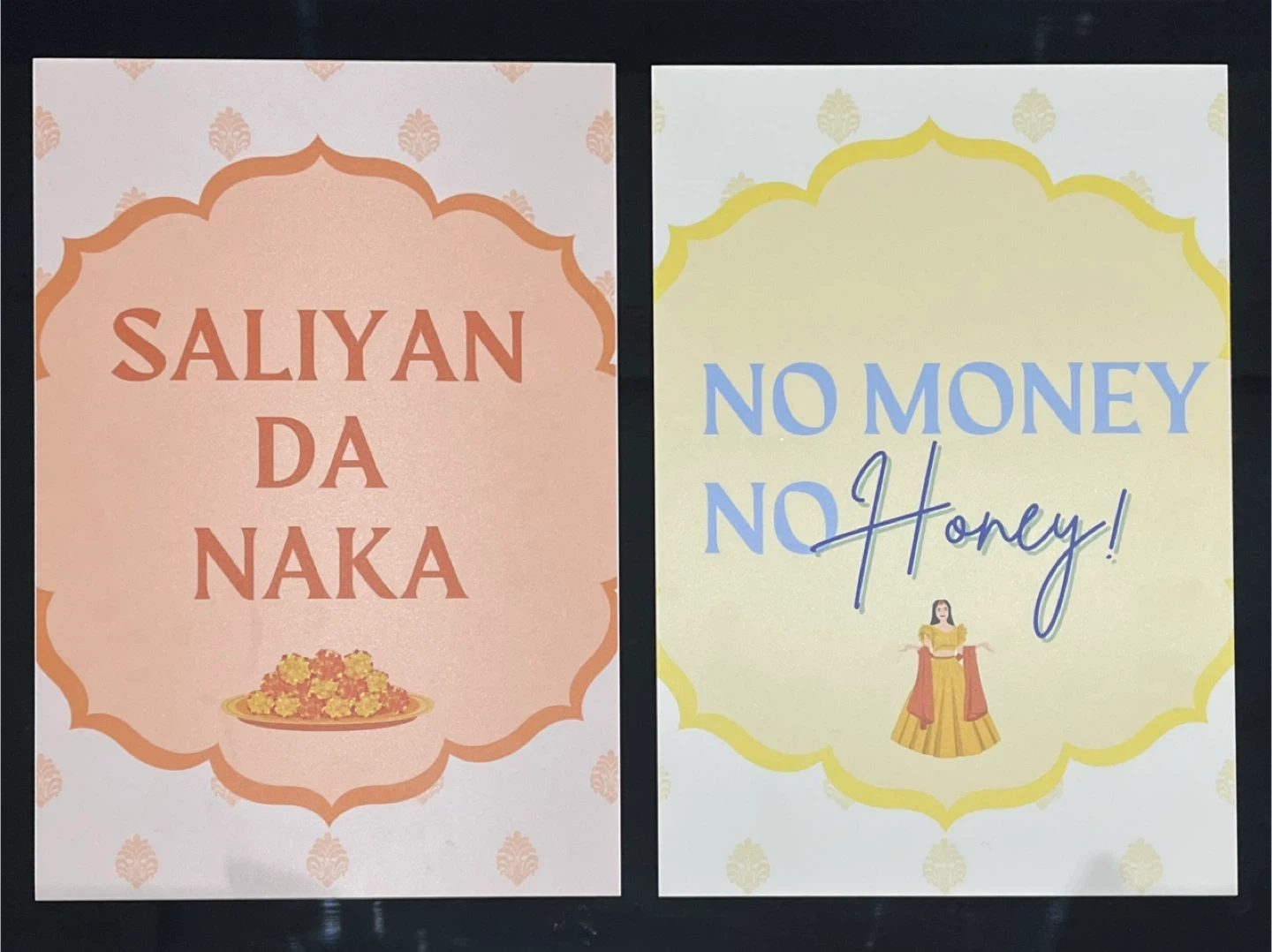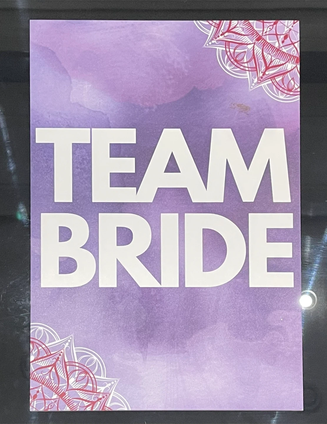 A set of decorative signs perfect for a bridal party or wedding celebration. Includes various fun phrases like "Team Bride", "Bridal Party Take Over", "No Money No Honey", and more. Adds a festive touch to your special event! Last poster “Team Bride” has a small mehndi stain.
