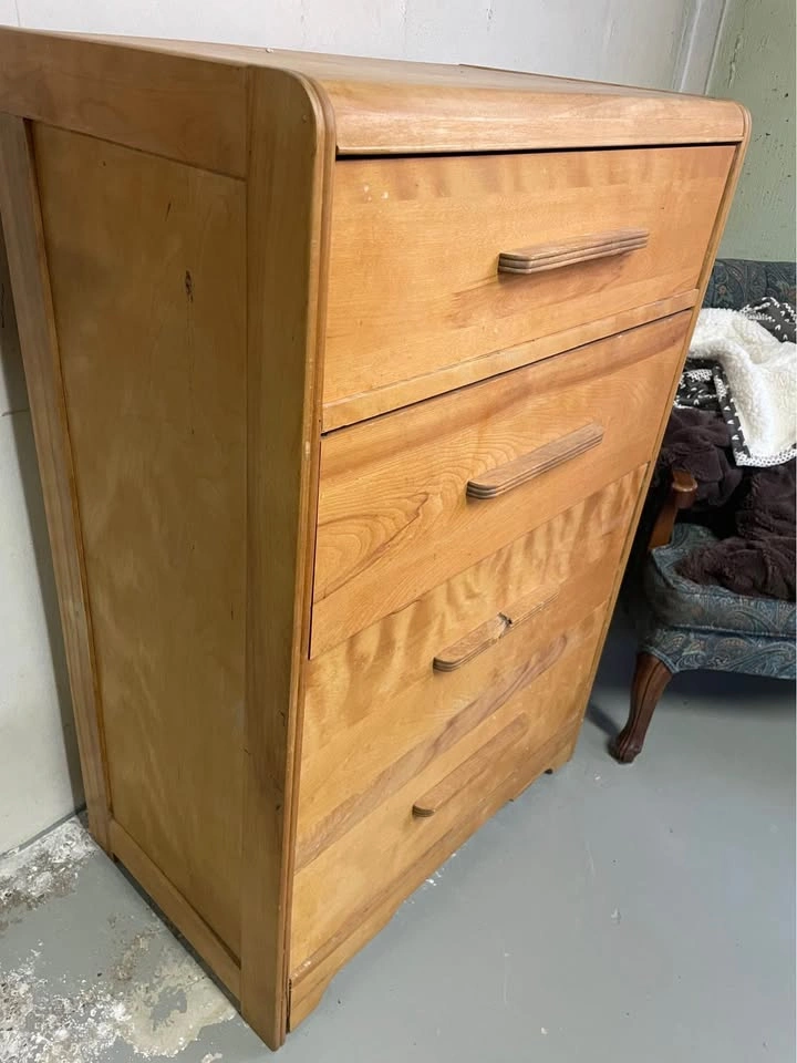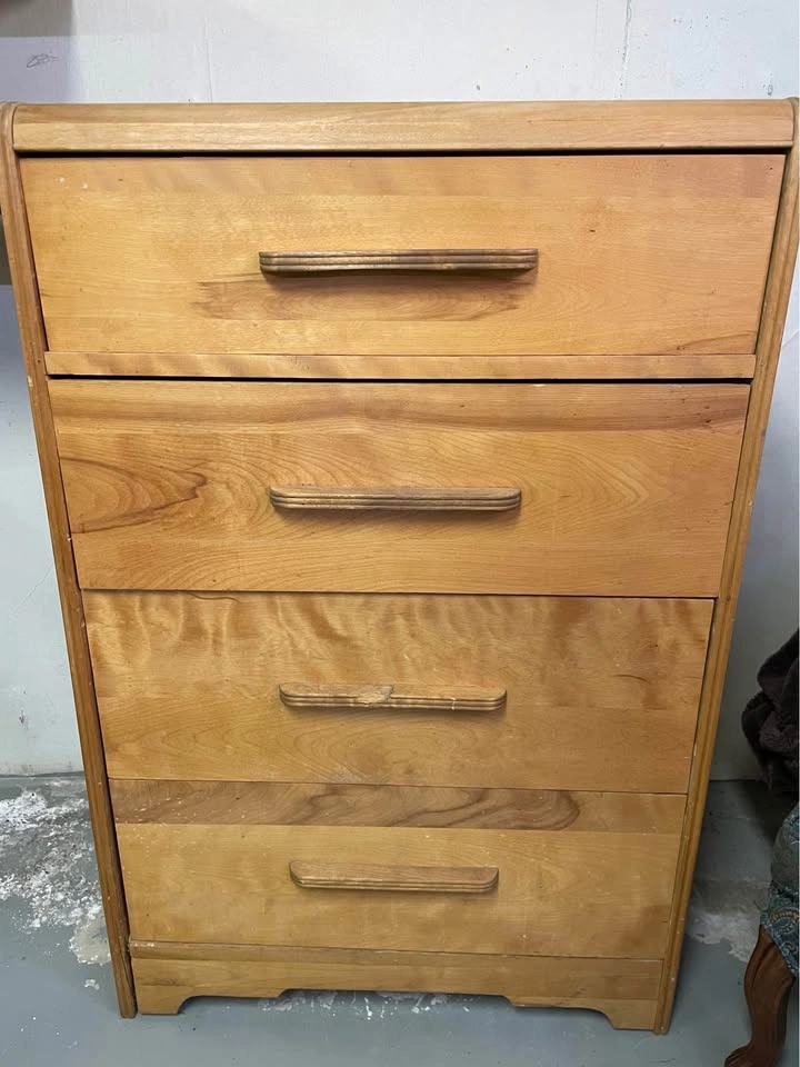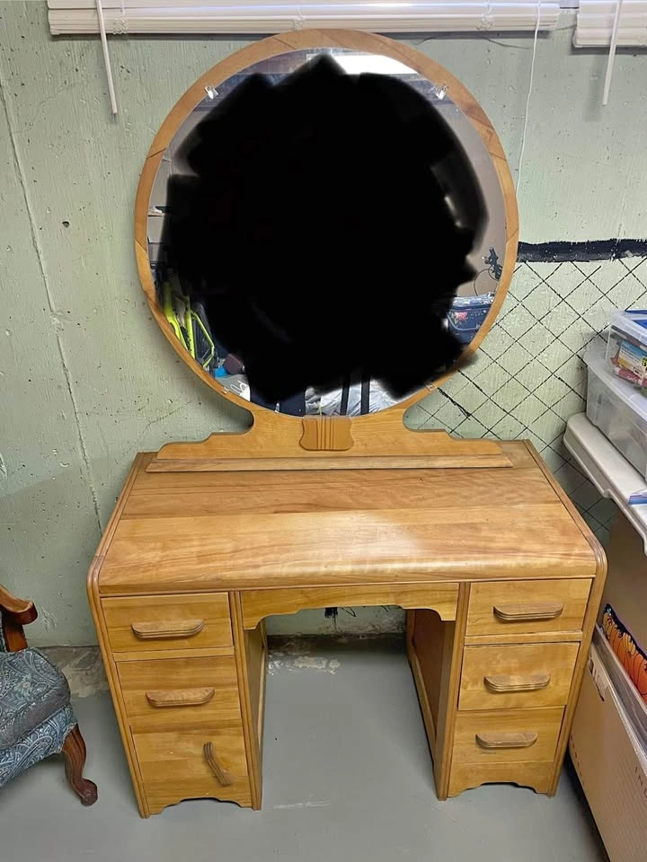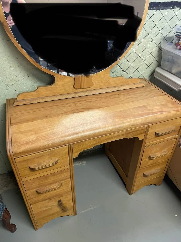 Vintage set. Drawer tower and makeup table with mirror. Will fix handle on makeup table before sale. A few worn handles and watermark on top of drawer tower but still in beautiful shape. Could be re-finished or stained. Still functional as is.