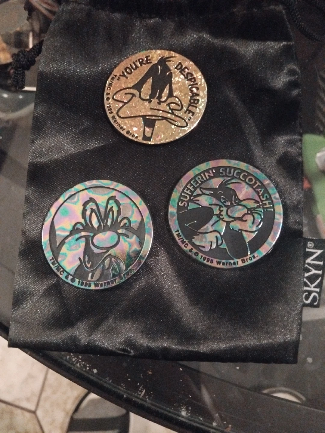 10Selling a set of three Warner Bros. Looney Tunes coins from 1995! The coins feature Daffy Duck saying "You're Despicable" and Sylvester the Cat saying "Sufferin' Succotash!" They come in a black SKYN pouch