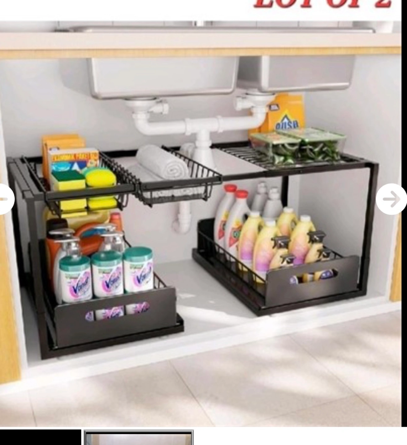 Two-tiered black metal organizer. Fits under most sinks. Great for storing cleaning supplies and dish towels. Pull-out drawers for easy access. New used, never opened box