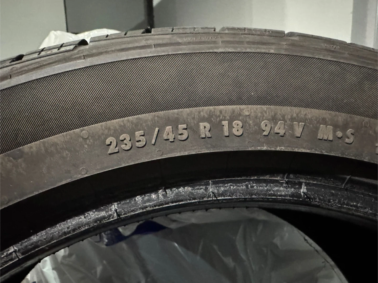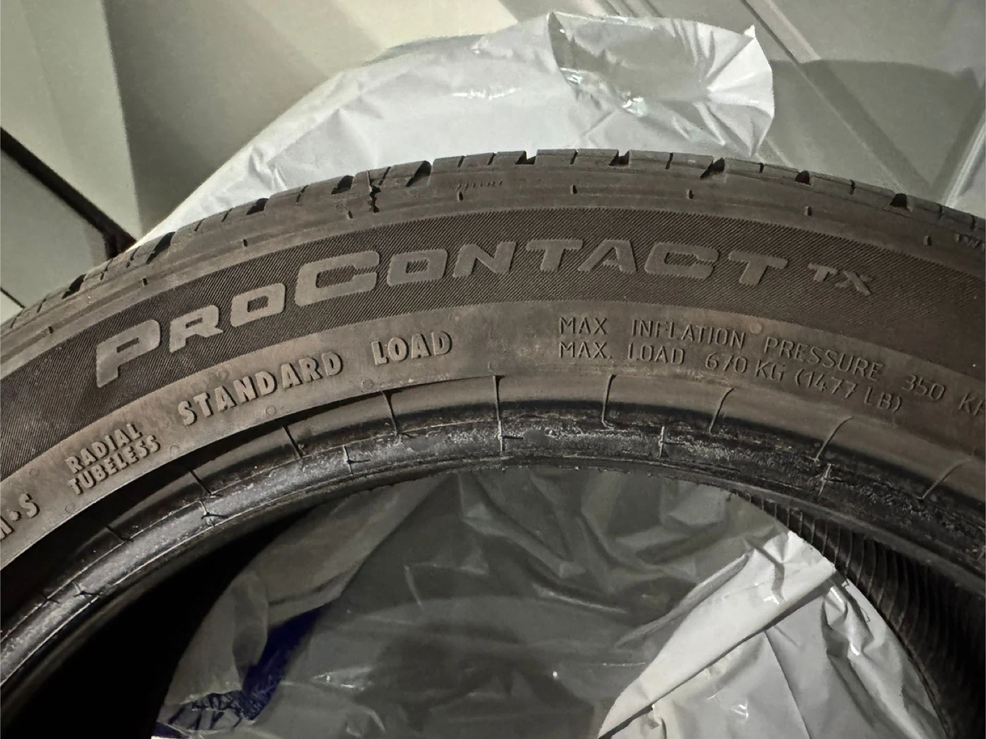 This is a Continental ProContact TX tire. It's a radial tubeless tire with a standard load. The tire size is 235/45 R18 94V M+S. Max inflation pressure is 350 kPa, and max load is 670 kg.