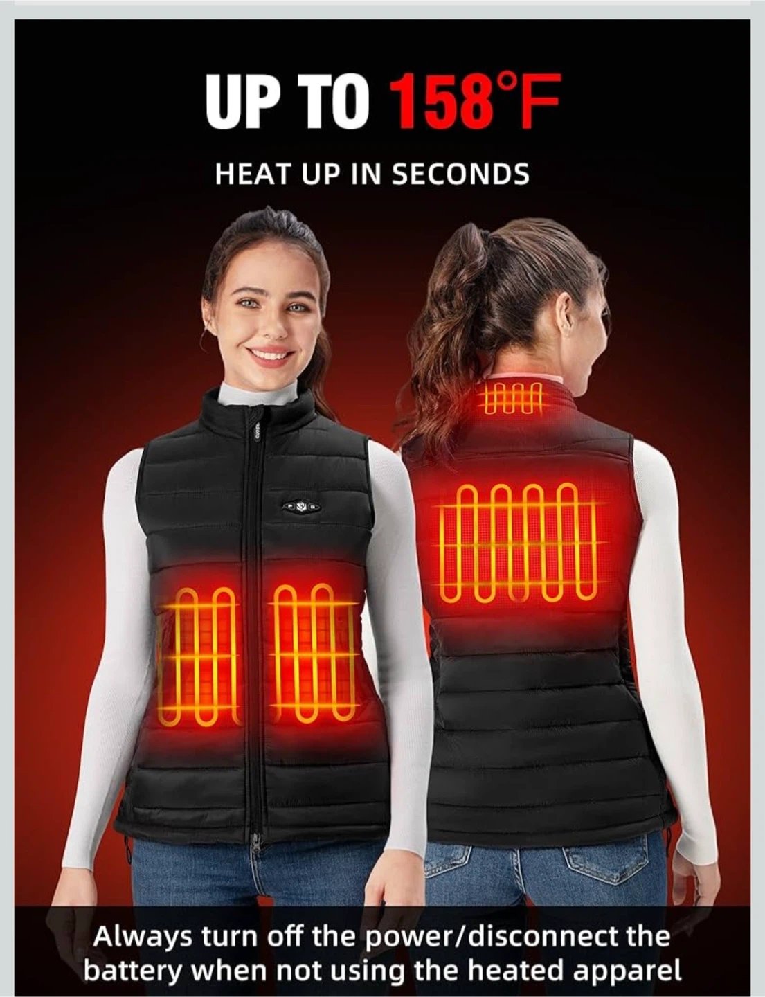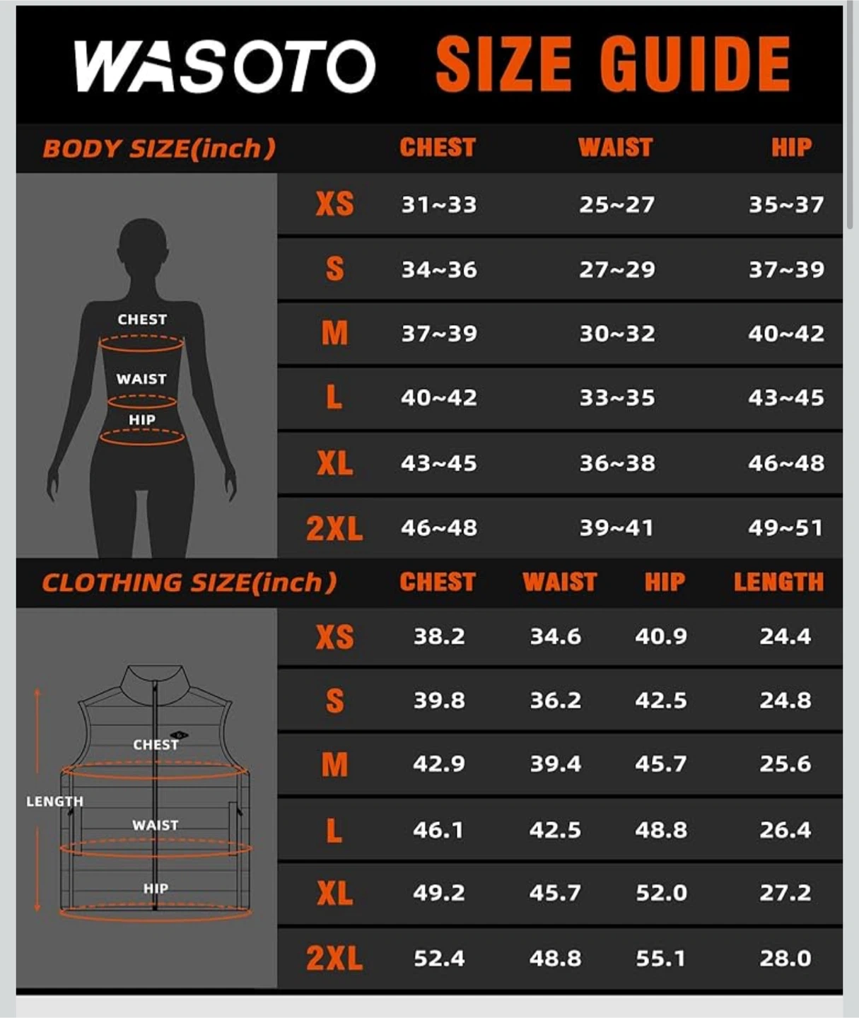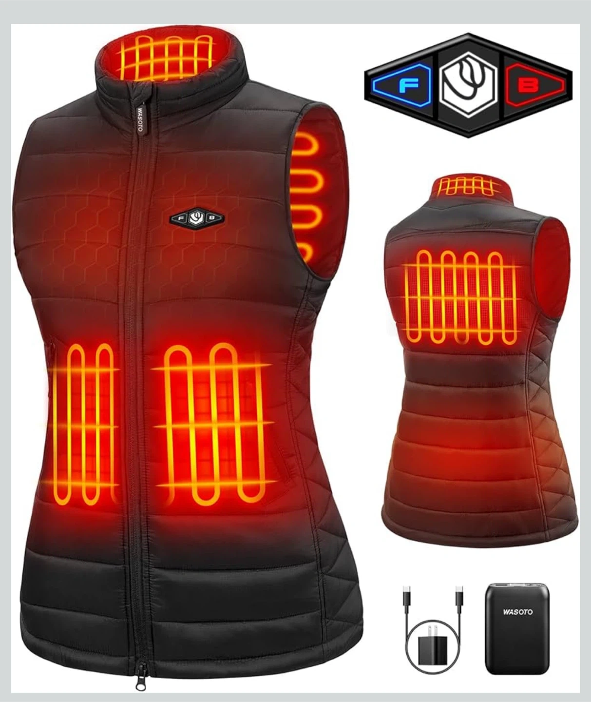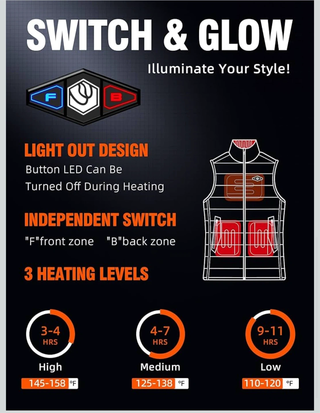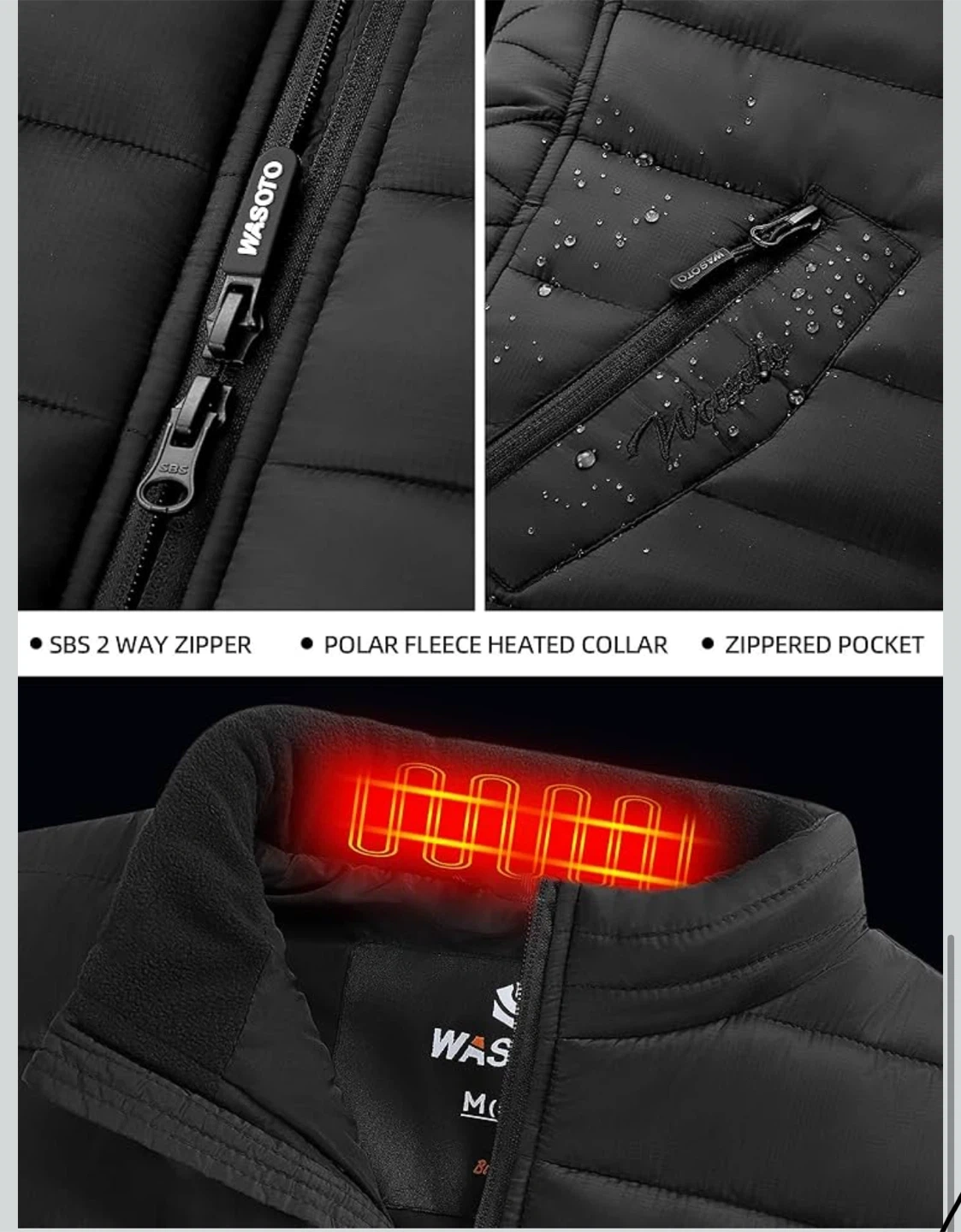 543Stay warm with this WASOTO heated vest! It features a polar fleece heated collar and a SBS 2-way zipper. The vest has a light out design with a button LED that can be turned off during heating. It also has an independent switch for the front and back zones, and 3 heating levels. It also has zippered pockets
