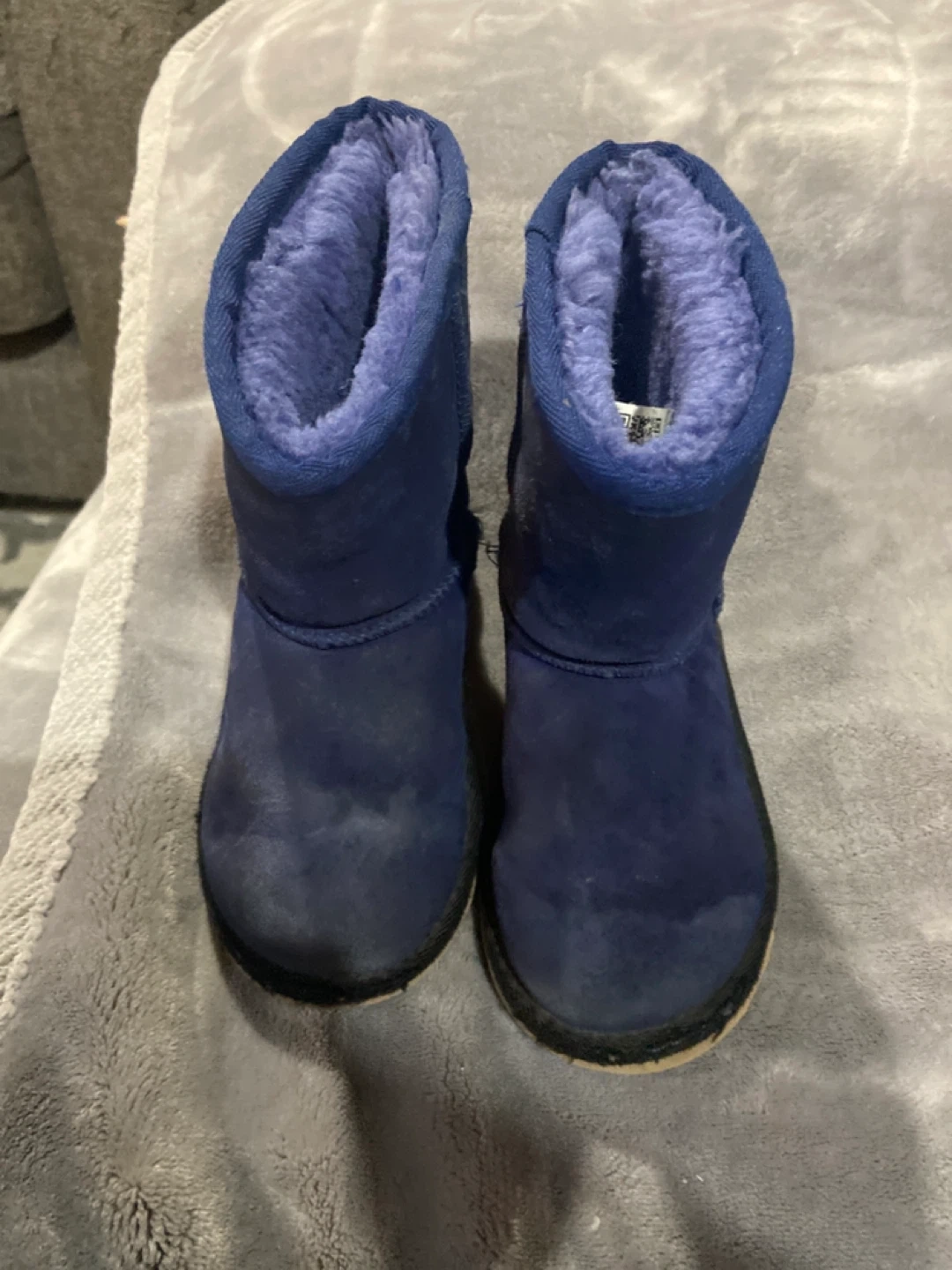 Children's blue UGG boots with a faux shearling lining. Made with suede material. These boots are great for keeping little feet warm and cozy.