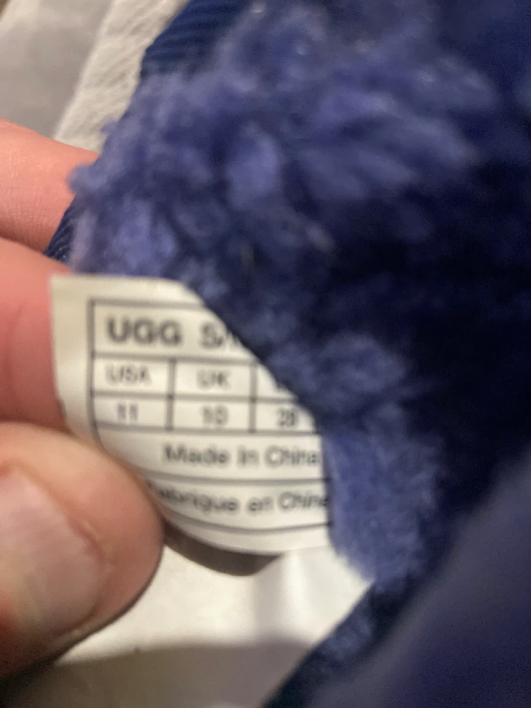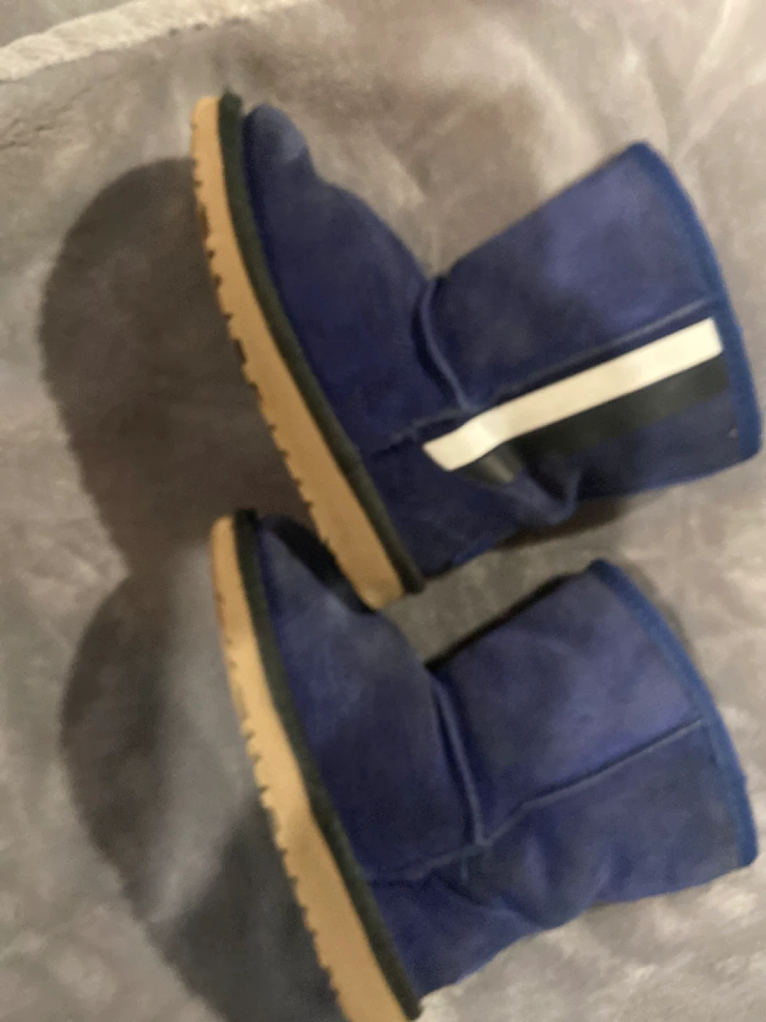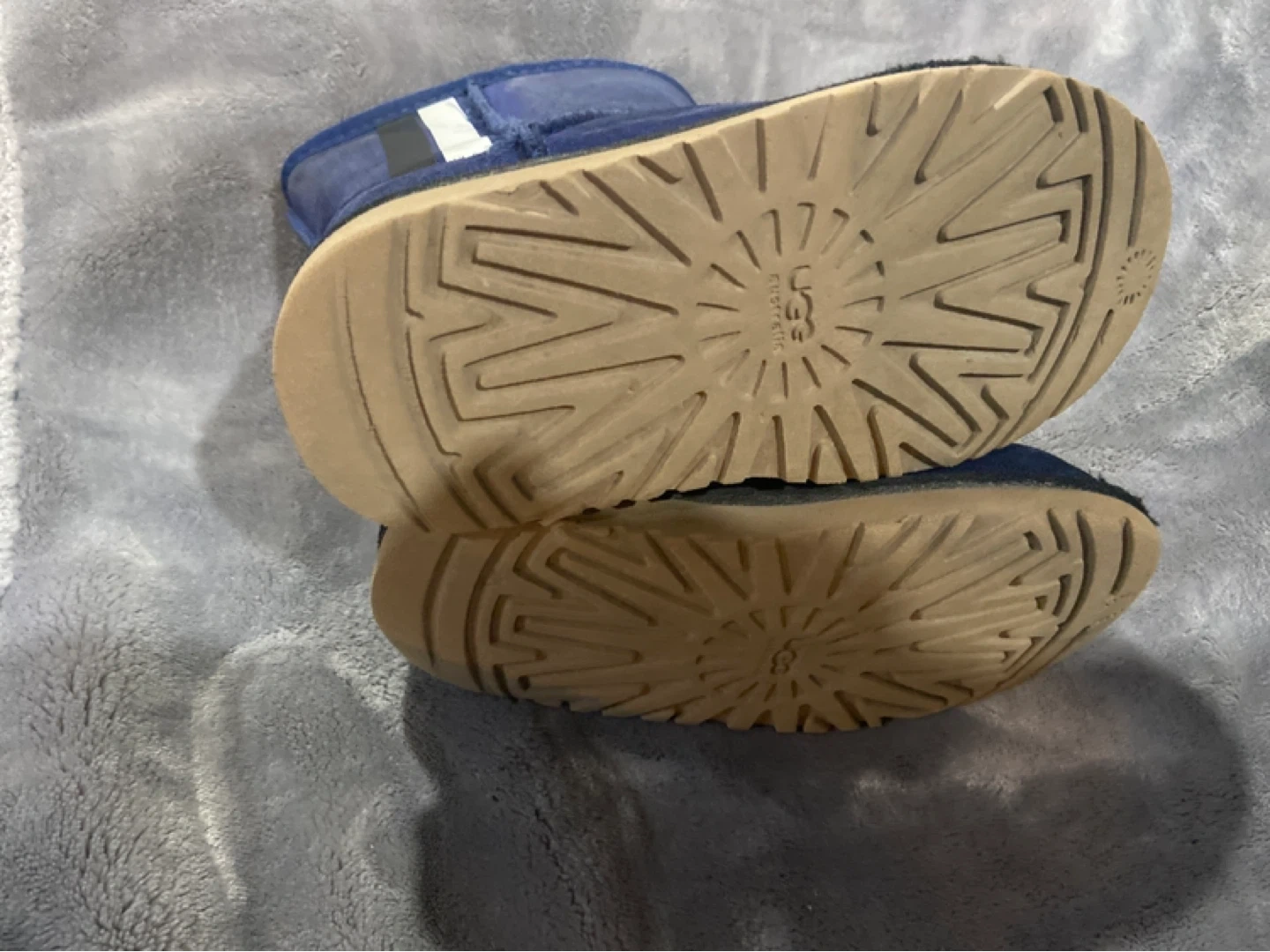 Children's blue UGG boots with a faux shearling lining. Made with suede material. These boots are great for keeping little feet warm and cozy.