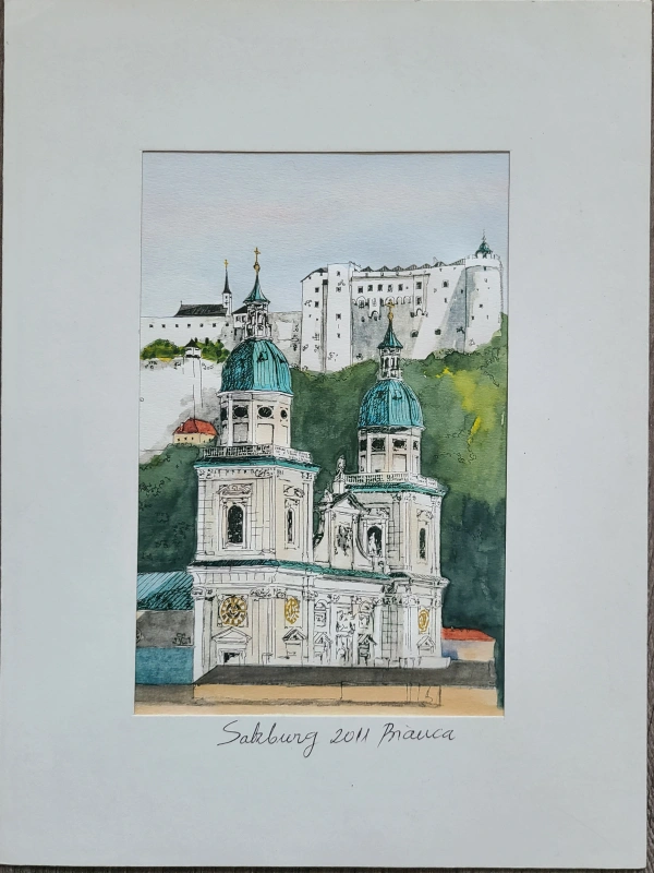 The image is a watercolor painting of the Salzburg Cathedral in Salzburg, Austria, with the Hohensalzburg Fortress visible on the hill behind it. The painting is signed "Salzburg 2011 Brauca" at the bottom. It is considered one of the earliest grand Baroque structures north of the Alps. *Not framed* Dimensions: 22cm x 13.5cm Pick up only. No delivery.