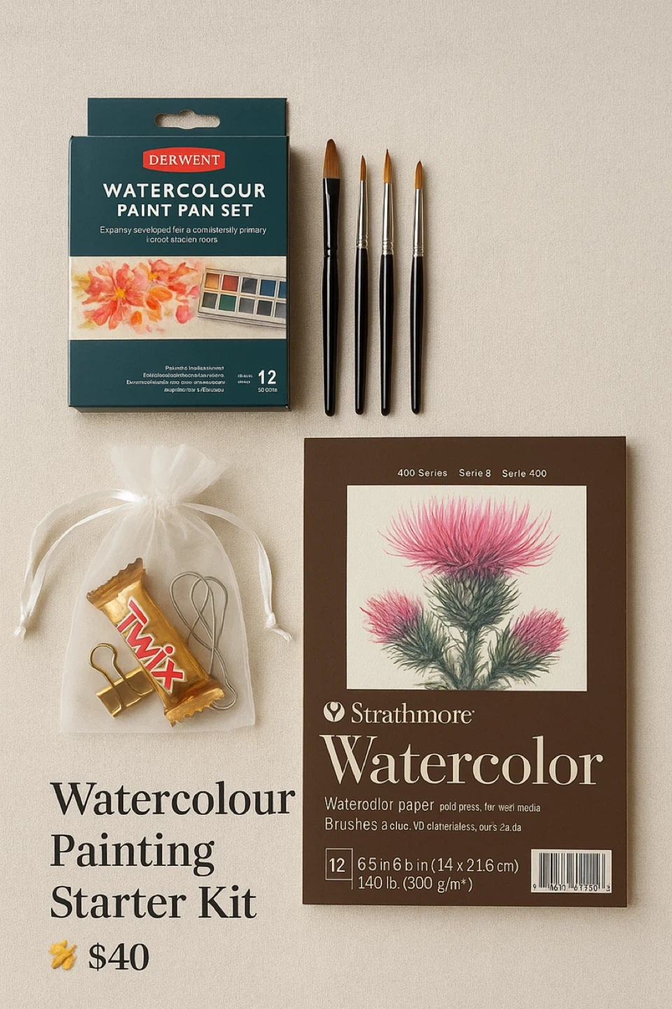 15Get started with this watercolour painting kit! It includes a Derwent watercolour paint pan set with 12 colours, Strathmore watercolour paper (6.5 in x 6 in), and a set of brushes. Also comes with a little treat!